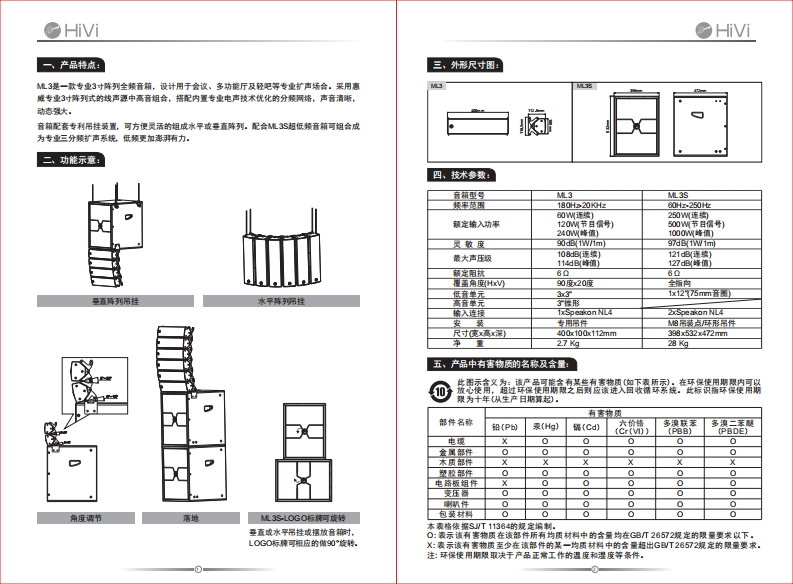 惠威专业音箱(ML SERIES MANUAL)M南威美国HM Acoustics.he.11530 Goldring Road ArcadiaCA 91006USATCt+162E9300E06F3+16269300E09HM南威中国珠海惠蓝料技有限公同广东省珠海市联纯工业区大林体山片区东成路南号电话:0W5662680B5传离:07任-6正8006,628052客户服务病线:40002091e产品说明书www.hivi.com女因计变更等原因,所示资料可能与亮物不符,怎不另通知。Due to the reasons in he change of design or others product irformation contained here may not bein conformity with product itsel We reserve the right ofno prar nodioe bdfore change.