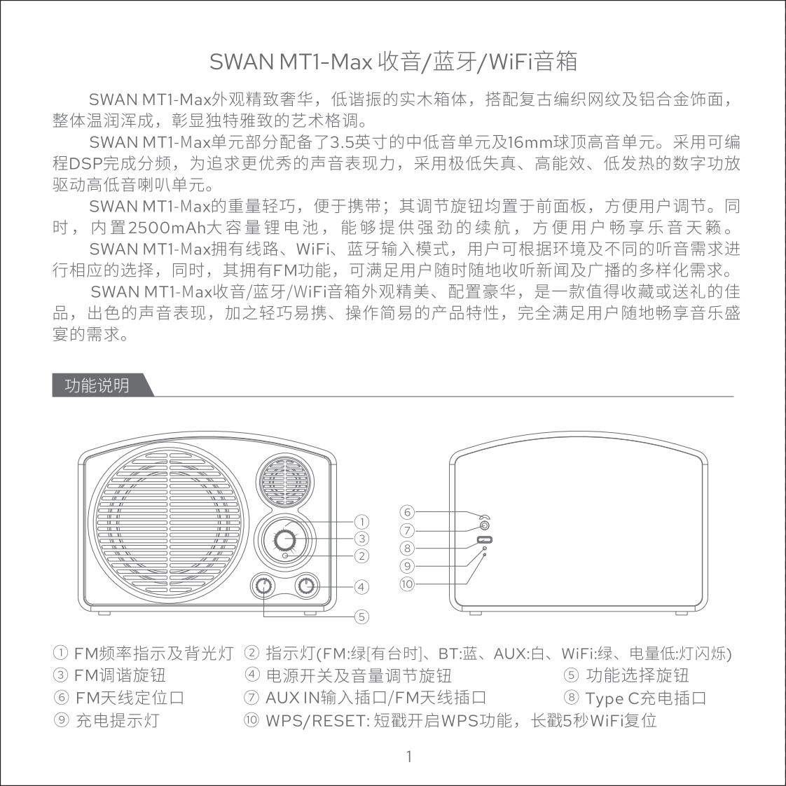 hivi惠威MT1-Max使用说明书手册-1348072@abc6个月前发布关注私信2.32MB7页033hivi惠威MT1-Max使用说明书手册-1此内容为付费资源,请付费后查看¥23¥34黄金会员免费钻石会员免费立即购买您当前未登录!建议登陆后购买,可保存购买订单付费资源 第1页 / 共7页 第2页 / 共7页 试读已结束,还剩5页,您可下载完整版后进行离线阅读 THE END说明书手册 文本预览 SWAN MT1-Max收音/蓝牙/WiF音箱产品说明书www.hivi.com 查看更多 收起部分 喜欢就支持一下吧收藏