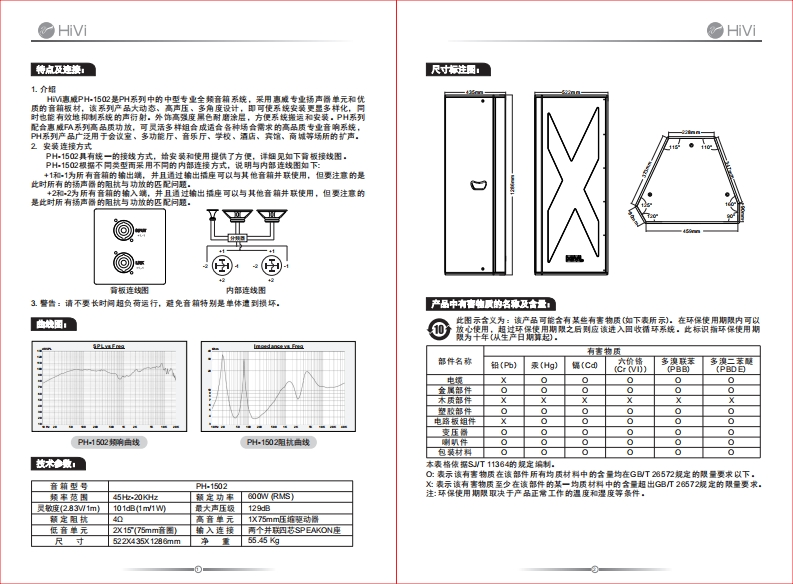 惠威专业音箱系统(PH-1502 MANUAL)HV惠威美国ViAcoustic气ne87 N Raymond Avre,Suite 200,Pasadena.CA91103.ULS.ARk+16269300E06Emai:sale④swan年0akec0tdh年hwan年eakers.com电威中国珠海惠磁料技有限公同广东省珠海市联港工业区大林山片区东成路南1号电话07566268156传商:07566268052客户服务线:4000209199wwwhivcom产品说明书www.hivi.com因设计变更等原因,所示资料可能与实物不符,怎不另行通知,Due to the reasons in the change of design or others,product information contained here may not bein conformity with product itselt We reserve the right df no prior nodice before change.