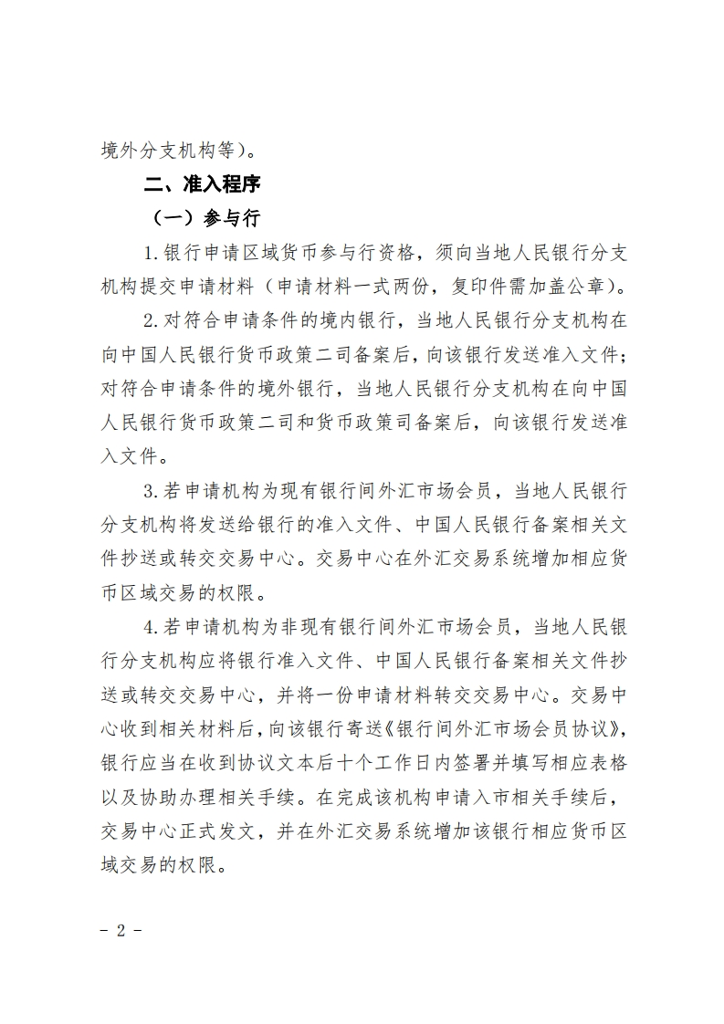 银行间外汇市场区域交易准入指引(试行)为明确银行间外汇市场区域交易的申请条件、申请材料和准入流程,中国外汇交易中心(以下简称交易中心)制定准入指引,具体如下。一、准入条件符合以下条件的银行,可申请人民币对银行间外汇市场区域货币交易参与行或报价行资格,进入银行间外汇市场进行相应货币对的人民币外汇区域交易。(一)境内银行1.中国银监会批准设立;2.具有国家外汇管理局(以下简称外汇局)批准的结售汇业务资格;3.银行柜台已挂出人民币对区域交易货币汇率报价:4.区域交易所属地区内的商业银行(包括地方性商业银行、中外资商业银行在当地的分支机构)或区域货币所属国银行在境内的分行或子行。(二)境外银行经中国人民银行备案同意的区域货币所属国人民币购售业务境外参加行和清算行(包括境外外资商业银行、中资银行-1