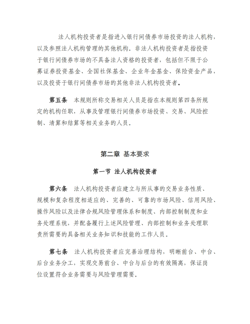 银行间债券市场债券交易自律规则(2009年10月23日第一届常务理事会第三次会议审议通过;2013年6月27日第三届常务理事会第六次会议修订)第一章总则第一条为加强银行间债券市场自律管理,规范市场参与者相关交易行为,有效防范市场风险,促进银行间债券市场健康发展,根据中国人民银行有关规定和《中国银行间市场交易商协会章程》,制定本规则。第二条本规则所称债券交易(以下简称“交易”)是指交易双方在银行间债券市场开展的相关交易行为,包括但不限于现券交易、回购交易、债券远期和债券借贷等。第三条本规则适用对象为银行间债券市场的市场参与者及交易相关人员。第四条本规则所称市场参与者是指从事本规则第二条所称交易的中国银行间市场交易商协会(以下简称“交易商协会”)会员机构,以及自愿接受交易商协会自律管理的各类法人机构投资者及非法人机构投资者。