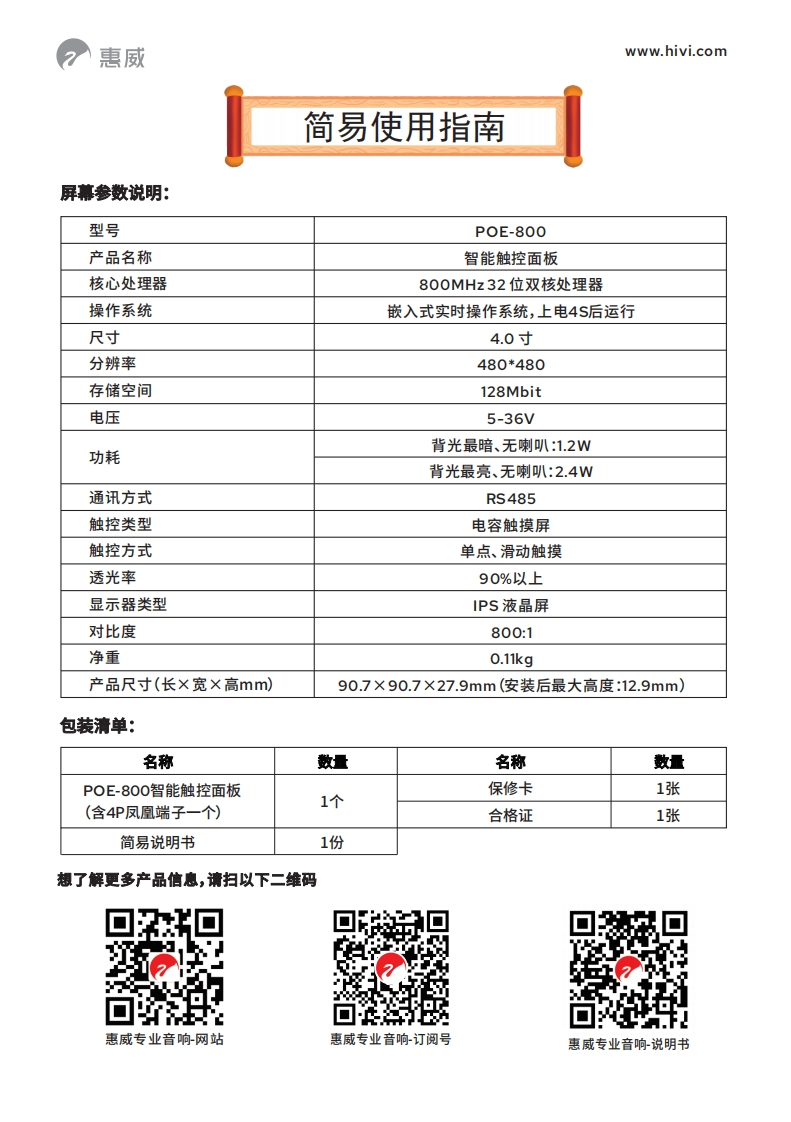 惠威www.hivi.com简易使用指南产品特点:感谢阁下选择惠威集团新推出的智能触控面板POE-8O01.标准86底盒设计,全镜面电容屏设计;2.采用32位800M嵌入式SOC处理器,内部集成SDRAM;3.支持JPEG图片压缩,矢量字库,多语言一键切换;4.支持常用组态控件和LUA脚本,图文刷新更快,可实现内部逻辑运算和自定义协议;5.支持类似安卓滚动、滑动特效,默认RS485通讯,可配置TTL。产品示意图:HiVi2 Hivi、眼主页音须二维码www.hivi.com1、GND:电源负极2、VCC:电源正极(电压5-36V)3、A:RS485数据A端POE-800旋触控面板4、B:RS485数据B端VCC-5-36VI'Qc,GND VCC A B夏面夏