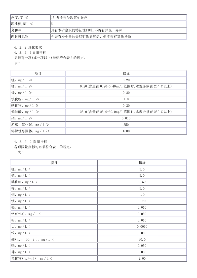 中华人民共和国国家标准饮用天然矿泉水Drinking natural mineral waterGB8537-1995代替GB8537-871主题内容与适用范围本标准规定了饮用天然矿泉水的水源及产品的技术要求、检验规则和标志、包装:运输、贮存要求。本标准适用于饮用天然矿泉水的水源水及其灌装产品。2引用标准GB7718食品标签通用标准GB/T8538饮用天然矿泉水检验方法3术语和定义3.1饮用天然矿泉水drinking natural mineral water从地下深处自然涌出的或经人工揭露的、末受污染的地下矿水:含有一定量的矿物盐:微量元素或二氧化碳气体:在通常情况下,其化学成分、流量、水温等动态在天然波动范围内相对稳定。4技术要求4.1水源评价4.1.1水源地4.1.1.1须进行区域地质调查(比例尺1:50001:25000)和水源地综合地质-水文地质调查(比例尺1:50001:25000)。4.1.1.2要有矿泉水生产井(孔)结构柱状图(比例尺1:2001:1000)或泉点实测地质剖面图(比例尺1:10000)。4.1.1.3必须有一个水文年以上的水温、水量、水位(压力)的动态监测资料。水温小于25℃的水源,每半月观测一次:水温等于或大于25℃的水源,每月观测一次。4.1.1.4抽吸矿泉水时,其水温、水量、水位应保持稳定,水位不可出现不可逆下降。水温变化范围不超过土1℃.4.1.1.5经丰、平、枯水期(采样间隔为四个月)的水质检验,其主要组分(溶解性总固体、K+NA+、C+、Mg2+、HC03-、S024-、CI-)的变化范围不应超过20%,所有水质检测结果,其特征性界限指标(实测值)均需符合表2要求。4.1.1.6以枯水期的水量作为水源的允许开采量,每日允许开采量应大于50T。4.1.1.7水源开发后,必须进行水质、水温、水量、水位的长期监测。4.1.1.8水源评价报告资料应符合附录A(参考件)要求。4.1.2水源卫生防护4.1.2.1水源地必须设立卫生防护区,在防护区界设置固定标志。4.1.2.2卫生防护区须符合下述要求,并有卫生防护区图(比例尺1:5000-1:10000)。4.1.2.2.1第一区为严格保护区。在泉(井)外围半径15m的范围内,无关人员不得入内。不得放置与取水设备无关的其他物品。4.1.2.2.2第二区为限制区。在矿泉水水源、生产区外围不小于30m范围内,不得设置居住区和工厂、厕所、水坑,不得堆放垃圾、废渣或铺设污水管道。严禁使用农药、化肥,并不得有破坏水源地水文地质条件的活动。4.1.2.2.3第三区为监察区。其范围应根据水源的补给与分布而定,是水源免受污染。4.2水质4.2.1感宫要求感宫应符合表1的规定。表1项目要求