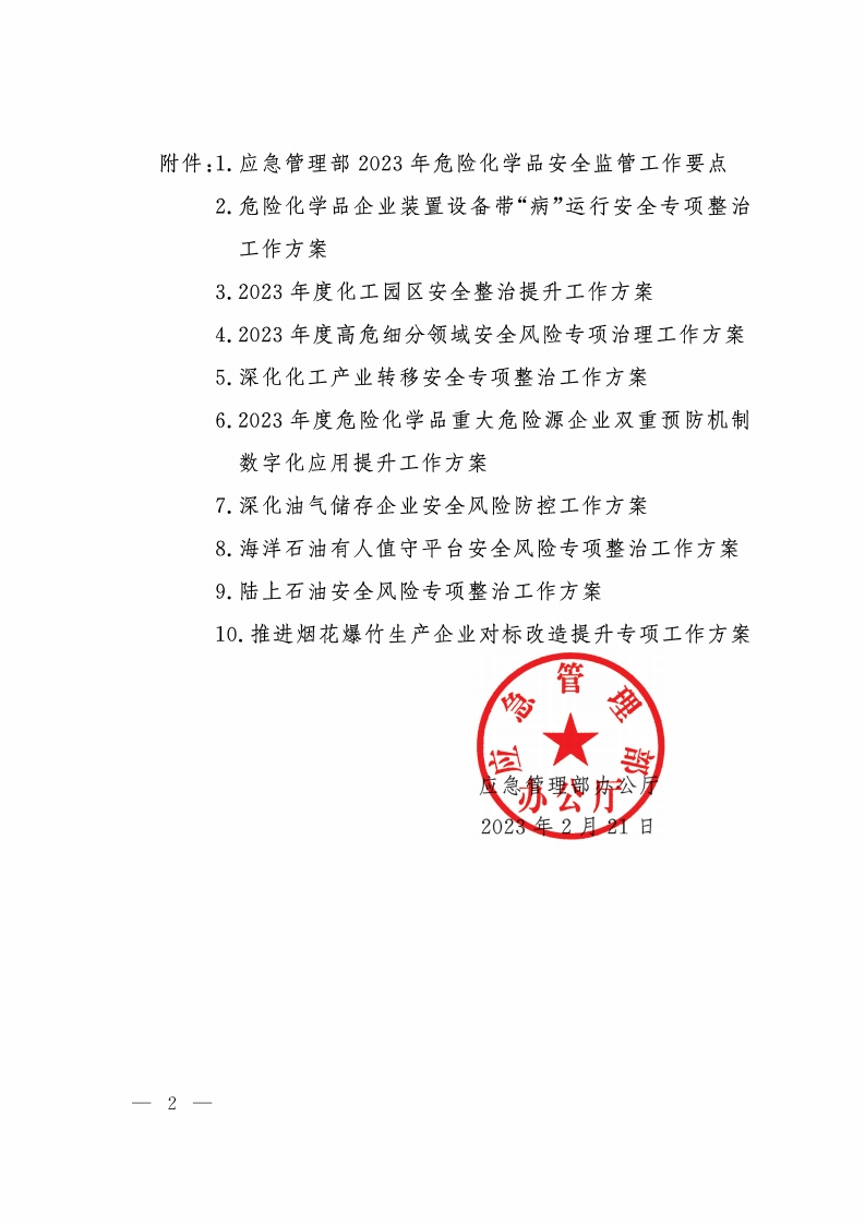 中华人民共和国应急管理部办公析文件应急厅〔2023)5号应急管理部办公厅关于印发2023年危险化学品安全监管工作要点和危险化学品企业装置设备带“病”运行安全专项整治等9个工作方案的通知各省、自治区、直辖市应急管理厅(局),新疆生产建设兵团应急管理局,海油安监办各分部,有关中央企业:2023年危险化学品安全监管工作要点和危险化学品企业装置设备带“病”运行安全专项整治等9个工作方案已经部领导同志同意,现印发给你们。各单位要强化组织领导,细化工作部署,明确责任分工,加强督导协作,严格质量要求,认真抓好落实。一1