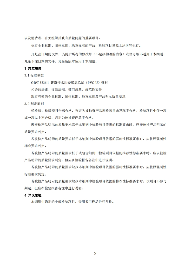 济南市硬聚氯乙烯(PVC-U)管材产品质量监督抽查实施细则(2025年版)1抽样1.1抽样方法以随机抽样的方式在被抽样生产者、销售者的待销产品中抽取。1.2抽样基数抽查样品基数满足抽样数量即可。1.3抽样范围抽查产品种类包括建筑排水用硬聚氯乙烯(PVC-U)管材。1.4抽样数量每根管材原始长度为4米/根时,每批次产品抽取样品5根(4米/根),每根管材截成4段(1米/段),每根中的2段作为检验样品,另2段作为备用样品。如每根管材的长度不足4m,可以增加抽取管材根数,保证截取段数满足上述要求。2检验项目及检测方法表1建筑排水用硬豪氯乙烯(PVC-U)管材产品检验项目序号检验项目检测方法规格尺寸(平均外径、壁GB/T5836.11厚)GB/T8806GB/T5836.12密度GB/T1033.1A法GBT5836.1维卡软化温度GB/T8802GB/T5836.1纵向回缩率GB/T6671B法5拉伸屈服应力GB/T5836.1GB/T8804.26断裂伸长率GB/T5836.1GB/T8804.2GB/T5836.17落锤冲击试验GBT14152GB/T5836.18铅限量GB/T26125注:上表所列检验项目是有关法律法规、标准等规定的,重点涉及健康、安全、节能、环保