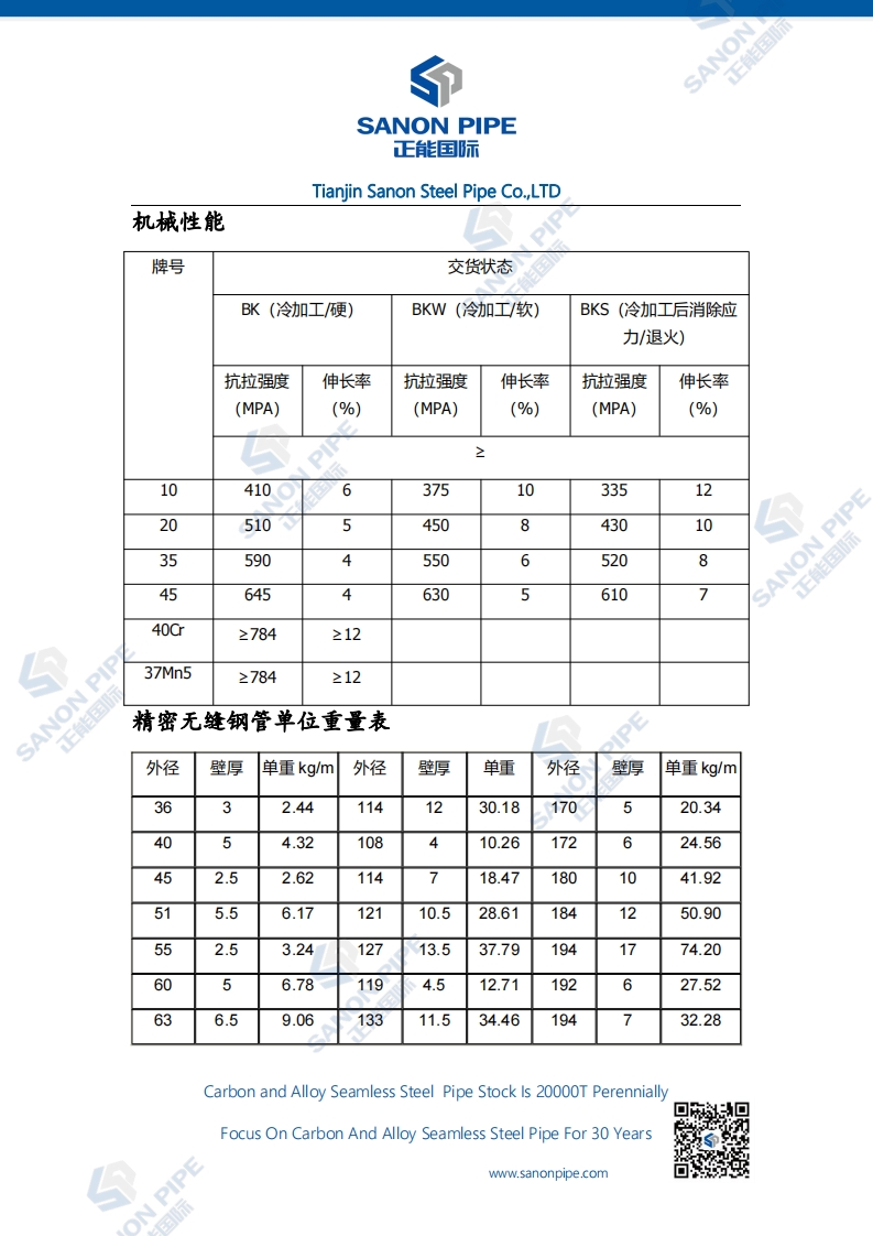 SANON正能国SANON PIPE正能国际Tianjin Sanon Steel Pipe Co.,LTD油缸钢管标准、材质、要求油缸钢管属于精密钢管,通常内外壁无氧化层,高压无泄漏,高光洁度,高精度,冷弯不变形,扩口压扁无裂缝。主要用来生产气动或液压元件的产品,如气缸或油缸,可以是无缝管,也有焊接管。主要材质有:10#,20#,35#,45#,40CR,25Mn,37Mn5执行标准:GB/T3639冷拔或冷轧精密无缝钢管GB/T8713液压机和气动缸筒用精密内径无缝管DIN2391-2无缝精密钢管技术供货条件SANON PIPE正能国宿化学成分牌号元素含量%SANON PIP正能国CSiMn9Cr100.07-0.130.17-0.370.35-0.65≤0.035≤0.035200.17-0.230.17-0.370.35-0.65≤0.035●≤0.035350.32-0.390.17-0.370.35-0.65≤0.035≤0.035450.42-0.50.17-0.370.5-0.8≤0.035≤0.03540G0.37-0.440.17-0.370.5-0.8≤0.035≤0.0350.08-1.125Mn0.22-0.290.17-0.3700.7-1≤0.035≤0.03537Mn50.3-0.390.15-0.31.2-1.5≤0.015≤0.02Carbon and Alloy Seamless Steel Pipe Stock Is 20000T Perennially▣Focus On Carbon And Alloy Seamless Steel Pipe For 30 YearsON PIPEwww.sanonpipe.com