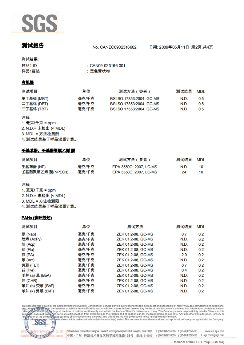SGS测试报告No.CANEC0902316602日期:2009年05月11日第1页,共4页鹤山市锦达油墨涂料有限公司中国广东省鹤山市共和镇工业西区以下测试之样品是由申请者所提供及确认:102白色、104特白、110光油、2010透明黄、203原黄、300玫红、302大红、3038桃红、3020透明红、401紫色、404群青、408翠兰、501黑色、506亮黑、501P平光黑、501B哑光黑、5501P平光黑、5501B哑光黑、5506亮黑、601特绿、701咖啡色、702红棕的混合物SGS工作编号11800464-SZSGS内部编号22客户参考信息主要成分:102白色、104特白、110光油、2010透明黄、203原黄、300玫红、302大红、3038桃红、3020透明红、401紫色、404群青、408翠兰、501黑色、506亮黑、501P平光黑、501B哑光黑、5501P平光黑、5501B哑光黑、5506亮黑、601特绿、701咖啡色、702红棕样品接收日期2009年05月05日测试周期2009年05月05日-2009年05月11日测试要求根据客户要求测试测试方法请参见下一页测试结果请参见下一页通标标准技术服务有限公司授权签名Sunny Huang黄防部门高级主管e printed overleaf or available on request and accessible at http:/www.sos.com/terms and.conditions.at the tine ofiny notion of the cootarppearance of this document is unlawful and offenders may be prosecuted to the fullest extent of the law.d thlts shown in this test report refer onty to the sample(s)tested.This document cannot be reproduced except in full,without prior approval of the Company.138Kezhu Roed Scerlech Park Guangahou Econori:&Techrolbg Develpmenl Distrid Guangzhou China 510663t86-20)82155555 f (86-20)82075113www.cn.sgs.com中国,广州·经济技术开发区科学城科珠路198号邮编:510663t62032155555f8-2082075113.5g5.ch3@sgs.c0mMember of the SGS Group(SGS SA)