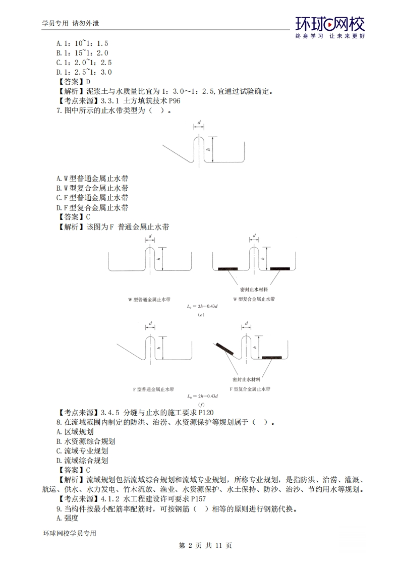 学员专用请勿外泄环球@网校终身学习让未来更好2025二级建造师《水利水电工程管理与实务》真题答案解析-完整版一、单项选择题(共20题,每题1分,每题的备选项中,只有一个最正确或最符合题意。选对每题得1分,没选或错选均不得分)。1.叶片泵的抽水装置不包括()A.叶片泵B.动力机C.泵房D.管路【答案】C【解析】由叶片泵、动力机、传动设备、管路及其附件构成的能抽水的系统称为叶片泵抽水装置。【考点来源】1.1.1水利水电工程建筑物的类型P152.水准仪基座一般装有()个脚螺旋。A.3B.4C.5D.6【答案】A【解析】水准仪由望远镜、水准器(包括管水准器、圆水准器)及基座三个主要部分组成。仪器通过基座与三脚架连接,支撑在三脚架上,基座装有三个脚螺旋,用于粗略整平仪器。【考点来源】1.2.2测量仪器的使用P353.材料孔隙体积占总体积的百分比称为材料的()。A.孔隙率B.密实度C.填充率D.空隙率【答案】A【解析】孔隙率,指材料中孔隙体积所占的百分比。密实度,指材料体积内被固体物质所充实的程度,其值为材料在绝对密实状态下的体积与在自然状态下的体积的百分比。填充率,指粉状或颗粒状材料在某堆积体积内,被其颗粒填充的程度。空隙率,指粉状或颗粒状材料在某堆积体积内,颗粒之间的空隙体积所占的比例。【考点来源】1.3.1建筑材料的类型和特性P414.管涌险情的抢护原则()。A.临水筑子堤B.上堵下排C.制止涌水带砂D.封堵闭气【答案】C【解析】抢护管涌险情的原则是制止涌水带砂,但留有渗水出路。【考点来源】2.1.5施工险情判断与抢险技术P755.孔径大于75mm,孔深大于5m的钻孔爆破称为()。A.光面爆破B.洞室爆破C.浅孔爆破D.深孔爆破【答案】D【解析】孔径大于75mm、孔深大于5m的钻孔爆破称为深孔爆破。【考点来源】3.1.2石方开挖技术P866.混凝土结构物与土石坝坝身连接部位,填土前应涂刷浓黏性土浆,泥浆土与水的质量比宜为()。环球网校学员专用第1页共11页