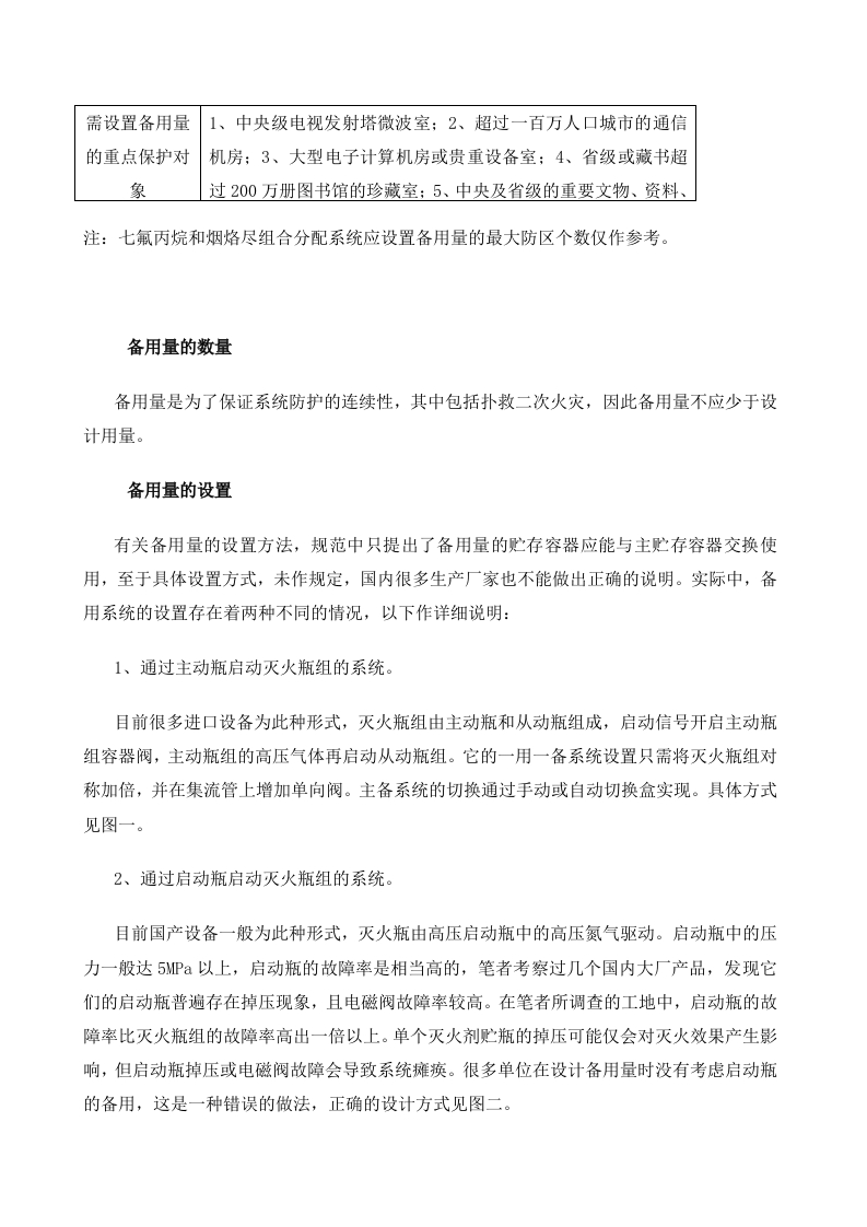 有关气体灭火系统灭火剂备用量的探讨作者:石峥嵘摘要:本文主要就气体消防灭火剂的备用问题进行了探讨,并针对工程实例,提出了解决问题的方法。关键词:气体灭火备用量设置条件设置方式启动方式近年来,气体消防设备的应用较为广泛,笔者在设计和施工中,发现人们对灭火剂备用量问题存在较模糊认识,相关国家规范也没有提出具体设计要求。本文在此作一探讨。备用量的设置条件气体灭火剂种类较多,但得以广泛应用的仅有二氧化碳、卤代烷(1211、1301)以及近几年从国外引进的七氟丙烷(F200)和烟烙尽(INERGEN)等。气体灭火剂一般高压贮存在灭火剂瓶内,当出现灭火剂已施放或泄露、设备检修或设备故障等情况时,可能造成系统保护中断。设置备用量的目是为了保证防护的连续性。我国规范提出:重点保护对象的防护区或超过一定防护区数量的组合分配系统应设置灭火剂备用量。重点保护对象是指性质重要、发生火灾后损失大、影响大的场所,对这些场所有必要进行不间断保护。组合分配系统的防护区数量增多,系统可靠性降低,火灾发生的机率增加,也有必要进行不间断保护。在国外,有的国家要求组合分配系统必须设置备用量,甚至有的国家不允许采用组合分配系统。根据我国和国外相关规范,将不同灭火剂的备用量设置条件列表如下:卤代烷二氧化碳七氟丙烷烟烙尽L1011100100)LINEDCRNY需设置备用量大于八个大于四个大于八个大于八个的组合分配系