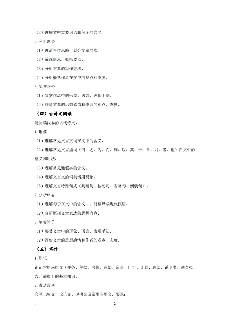 语文考试标准一、考试范围和要求(一)语言知识和语言表达1.识记(1)正确识记现代汉语普通话常用字的字音。(2)正确识记并规范书写常用汉字。2.理解理解复杂长句的含义。3.表达应用(1)正确使用常用词语。(2)正确使用标点符号。(3)辨识和改正一般的病句(语序不当、搭配不当、成分残缺或赘余、结构混乱、表意不明、不合逻辑)。(4)正确运用常见的修辞方法(比喻、比拟、借代、夸张、排比、对偶、设问、反问、反复)。(5)扩展语句、压缩语段,区别和变换句式,仿写句子。(6)把握句子的重音、停顿、语气和节奏。(7)能根据不同的交际场合和交际目的,恰当地进行口语和书面语表达。(8)语言表达准确、简明、连贯、得体、鲜明、生动。(二)文学、文化常识和诗文背诵识记(1)识记常见的中外著名作家作品知识.(2)识记常见的文化常识。(3)识记常见的文体和相关的文体知识。(4)默写常见的名言名句。(三)现代文阅读能阅读社科类文章、科普类文章、人物传记、新闻、诗歌、散文、小说、戏剧等。1.理解(1)理解文中的人物、事件、事物、事理、观点、情感等。