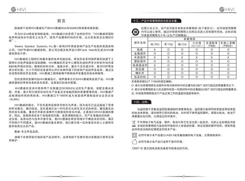 ▣扫码关注HV惠威集团公众号Hivi M3A/HiVi M3AMKII注册产品即享延保高保真有源音箱产品说明书M雨减美国HVAcoustics,Ina.87 N.Raymond Ave.Suie 200,Pasadena,CA91103,U.S.A.Tel:+1 626 930 0606 Email:sake8warnspeabers.comWebsile:hipg:(swanspeakerd.com事藏中国妹海重威科技有限公司广东当珠海市联港工坐区大林山片区东戒璃南1号电话:07566266035传离:07566268052客户服务热战:400-00-919的HiVi M3AMKII CMIIT ID:2019DP1058www.hhvi.comwww.hivi.com因设计变更等原因。桥示资料可儒与实物不符,想不另行通知Cue to the reasons in the change of design or others.product information contained here may not bein confomity with product itselt.We reserve the right of no prior notice before change.