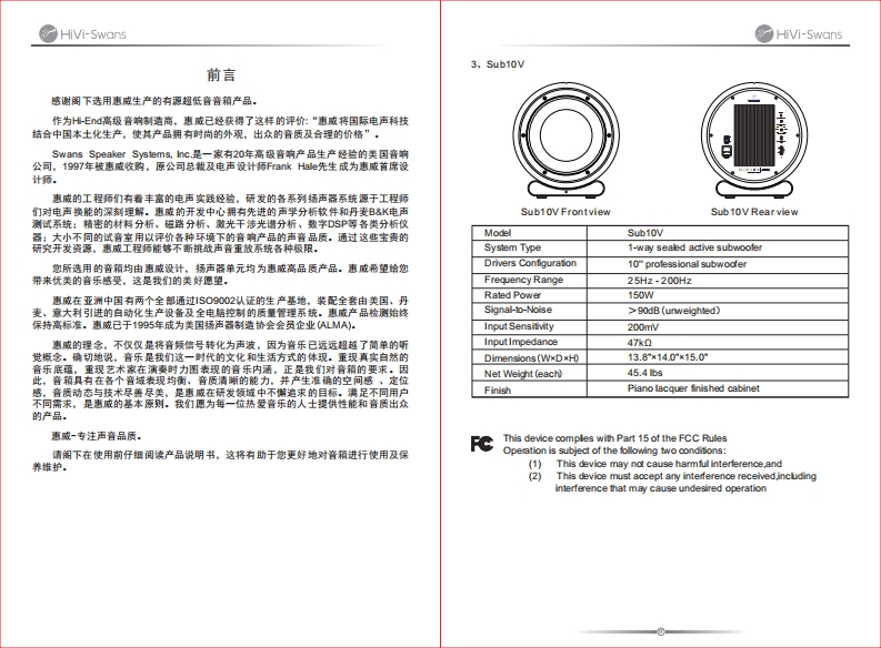 ▣之扫码关注惠威集团公众号SUB有源超低音音箱注册产品即享保修产品说明书设t扣≤ign HViSwans刺造商血hcu@C珠海惠蓝料技有限公同地址Add©至珠海市联鬼工业区东成暗南1号电话打c业400-0E0-919www.hivi.com因设计变更等原因,所录资料可能与实物不符,怎不另行通知。Due to the reasons in the change of design or others,product information contained here may not be