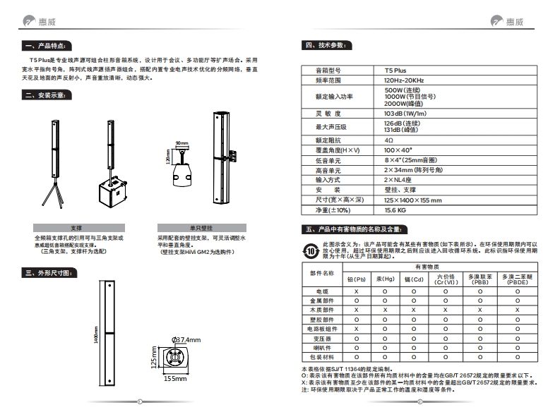 惠威专业音箱T5 PlusM惠威美国HiM Acoustics.he.11530 Goldring Road ArcadiaCA 91006USATCt+162E9300E06F3+16269300E09M南威中国珠海惠蓝料技有限公同广东省珠海市联纯工业区大林体山片区东成路南号电话:0W5662680B5传离:07王-6正80066268052产品说明书客户服务病线:40002091里www.hivi-pro.com女因计变更等原因,斯示资料可能与亮物不符,怎不另通知。Due to the reasons in he change of design or others product irfommation contained here may not bein conformity with product itsel We reserve the right ofno pror nodoe bdore change.