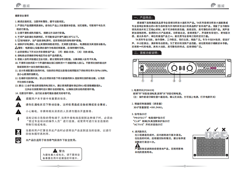 惠威音频功率放大器TA2350/TA2500/TA2650HV唐威美国Hivi Accusties,He.11630 Goldring Road Aradia,CA 91005.USAT+16269300605Fa+16269g0C609HW唐威中国味海事藏料技有果公同广东省强海市联港工业区大林山片区东战座南1等卓话:0756-6286005传离:0756626800,628052客户相务鹅线:4000909199产品说明书www.hivi.com/pro本因设计室更等原因,所示通料可能与实物不符,数不行通知0u切nnfdThe、product im mstion con ned here may notin oonformity with product tselt.We resenve the right af no prior notioe before change.