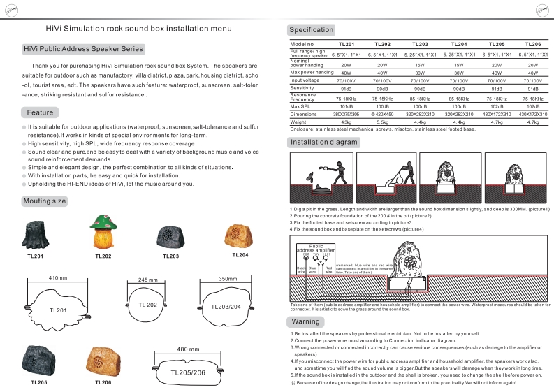 仿石园林音箱系列安装使用说明意成公共广指系列型号T201TL202TL203T1204TL205T1206全频/离级m.5X1.1x16.5X1.1X15.25x1,广x15.25x11X16.5X11X18.51.1X额定功率20W非常高兴您选”HiV1”仿石园林音箱系列,本产品是专为室外环境中使20W15W15w20W20w最大功率40W40W30W33w40W40w用面设计,仿造天然岩石精心制作,具有防雨、防潮、耐衡蚀、寒附高温、附输入电压70w100W70w100v70100W701100W70/100w70/1C0W冲击、造型独特等优点,广泛应用于工厂、别墅区、广场、公园、住宅小区、具植度91d39odgBDdB90dB81dB91dB频响范围7乃-18KHe75-15H地85-18(H85-18K0z7518K027518K0Hz学校、旅游区等…最大声压细101dB100uB100dB100dB102dB102dB尺寸380375X36中420K45032002822210320028222104901722310438K1722310生能特点435.5k7474.4k94.94.29后作,g6X1一不情视夏基、阶子、不青湘1。全天候设计(防水、耐热、耐盐、抗硫),可在多种特殊环境下长期使用:●高灵钣度、高声压级设计,宽广的颜响覆盖范围:安装粉引。声音清晰纯净,轻松应对各种背景音乐和语音扩声需求:·简钓大方的外观设计,能与各种场合完美融合:·配有完善的安装配件,使安装更为简便迅捷:●秉承惠成一贯的HI-END理念,让音乐无处不在.安装尺寸充在真地上挖一个长毫在前内德住00别按闲示家装角架及大干痛体深为0里的词板士越阳华惠压军栓整铁袋器型TL201TL202TL203TL204t,高线丸桶不蒙州时接410mm245mm350mmnmwTL202色可意其中一类功校按以上图示接线,接头敏好防水措感:建这在产品周国圳上草皮,以用如美感TL201TL203/204着告1,本产品需专业人员进行安装,丰专业人员切匆自行安表2、接电簿线时必须按产品电避线上的接线标示图连接:480mm3、错接或接法不当将导致严重后果(如损坏功放或烧喇队):4,如将公共广播功放与家庭功战线错接时音箱一样会发出声音并且音量有时还大些,此时长期使用将烧坏喇从(扬声暑)1TL205/2065,产品处于室外环境时,产品外壳破碎后不能使用,需更换后方可通电工作TL205TL206爹因授计变更等原因,所示资料可能与实物不符,笼不另行通知