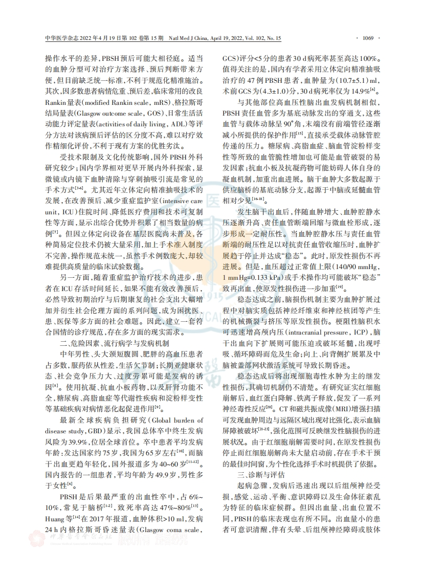 ·1068·中华医学杂志2022年4月19日第102卷第15期Natl Med J China,April19,2022,Val.102,No.15·标准与规范·原发性脑干出血诊治中国神经外科专家共识中华医学会神经外科学分会脑血管病学组中国医师协会神经外科医师分会脑血管外料学组通信作者:张建民,浙江大学医学院附属第二医院神经外科,杭州310009,Email:zjml35@ju.edu.cn;康德智,福建医科大学附属第一医院神经外科,福州350005,Email:kdz99988@sina.com【摘要】原发性脑干出血(PSH)是脑出血最致命的亚型,起病急骤,致残、致死率极高,对现存治疗手段构成挑战。由于缺乏相关循证医学研究,国内外均没有相关的专家共识和指南。本文汇聚国内医学会和医师协会两大脑血管外科学组专家及所在单位的经验,达成以下中国专家共识。从危险因素、流行病学、发病机制、诊断与评估、治疗、预后、预防和干预等角度展开,并对不同治疗手段进行了分类阐述,旨在为大家对PSH提供临床诊治参考和建议。【关键词】原发性脑干出血:高血压性脑干出血;诊断与评估;治疗;专家共识基金项目:浙江省脑卒中诊治技术研究中心(JBZX-202002):浙江省神经疾病临床医学研究中心(2021E50006)原发性脑干出血(primary brainstem01术的不断发展,传统观念不断受到挑战。本文汇聚hemorrhage,.PBSH)是指排除了外伤、血管畸形、肿国内医学会和医师协会两大脑血管外科学组专家瘤等可湖源继发性因素的自发性脑干出血。在无CA及所在单位的经验,同时综合国内外相关研究成法溯源的PBSH中,多数伴发高血压病,在国内常果,达成以下中国专家共识,旨在为大家提供PBSH称为高血压性脑干出血(hypertensive brainstem临床诊治的参考和建议。hemorrhage,.HBSH),是高血压脑出血的最致命亚一、概要型。血肿通过对脑干神经核团、传导束、网状上行PBSH是高血压性脑出血最严重的亚型,占所激活系统等重要结构造成破坏、挤压,迅速引发一有高血压性脑出血的6%-10%a,最常见部位发生系列严重症状。通常起病急,致残、致死率极高,对在桥脑。责任血管位于脑干内部、邻近的小脑或丘现存所有治疗手段构成挑战。由于高血压脑出血脑,溢出的血液在脑干间质内扩展或由邻近丘脑、的发病情况及治疗理念不同,国外发达国家很少对小脑向脑干内扩展并形成血肿,还可累及脑室系高血压脑出血进行积极手术干预,特别是对PBSH统。损伤类型包括原发性损伤、继发性损伤及的手术治疗列于手术禁忌之列。虽然国内许多单脑脊液循环梗阻所致急性颅内压增高引起的损伤。位已开展PBSH的手术治疗,但缺乏规范的循证医因受损结构特殊,残存功能有限。此外,重症管理学研究。因此,目前国内外均没有PBSH相关的专不当及手术造成的医源性损伤也不容忽视。家共识和指南。随着医学影像、评估方法和微创技由于出血量、累及部位、基础疾病、重症管理与D01:10.3760/cma.j.cm112137-20211228-02913收稿日期2021-12-28本文编辑朱蹈引用本文:中华医学会神经外科学分会脑血管病学组,中国医师协会神经外科医师分会脑血管外科学组.原发性脑干出血诊治中国神经外科专家共识01中华医学杂志,2022,102(151068-1075.D01:10.3760/emaj.cn112137-20211228-02913.