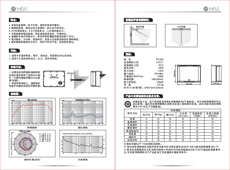 惠威壁挂扬声器系统(TW109 MANUAL)V速威美国ViAcostc气ne11630 Gddring RoadArcada.CA 91006.USARet+16269E00606Fa1c+16269300E09V南威中国珠海惠蓝料技有限公同广扫珠海市联港工业区大林山片区东成暗南1号电话.07任-8035传商:07566263006,6正8052客户程务满线:400-0E09199产品说明书因设计变更等原因,所示资料可能与宾物不符,怎不另行通知。www.hivi.comDue to the reasons inthe change of de sign or others.product information containedhere may not bein con formity with product itselt Wereserve the right of no prior nodice before change.