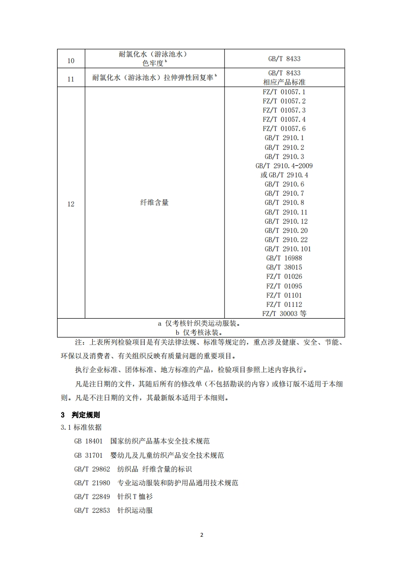 济南市运动服装产品质量监督抽查实施细则(2025年版)1抽样1.1抽样方法以随机抽样的方式在被抽样生产者、销售者的待销产品中抽取。随机数一般可使用随机数表等方法产生。1.2抽样基数抽查样品基数满足抽样数量即可。1.3抽样范围抽取同一批次的产品。1.4抽样数量每批次产品抽样数量见表1。表1运动服装产品抽样数量序号产品种类规格型号抽样数量1泳装/5件/条/套(其中备样2件/条/套)2其他运动服装2件/条/套(其中备样1件/条/套)注:1.分体式泳衣或泳裤抽样数量为10件/条/套(其中备样4件/条/套):2.若样品面积过小,比如比基尼泳装,可适当增加抽样数量,但不得超过检验、复检的合理需要。2检验项目及检测方法表2运动服装产品检验项目序号检验项目检测方法1甲醛含量GB/T2912.12pH值GB/T7573GB/T175923可分解致癌芳香胺染料GB/T233444耐水色牢度GB/T57135耐酸汗渍色牢度GB/T39226耐碱汗渍色牢度GB/T3922耐干摩擦色牢度GB/T39208耐光、汗复合色牢度“GB/T145769耐海水色牢度“GB/T5714