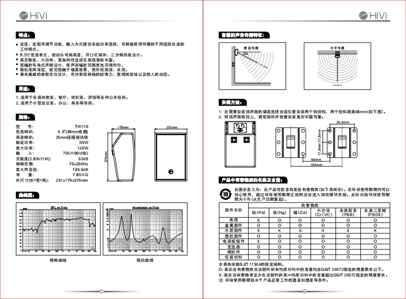惠威壁挂扬声器系统(TW110 MANUAL)V速威美国HiViAcoustc气ne11630 Gddring RoadArcada.CA 91006.USARt+16269E00e0cFa1c+16269300E09V随威中国珠海市威料技有限公同广存珠海市联速工业区大林山片区东成路南1号电话.07年-68035传商:07566263006,6还8052客户服务搞线:400-0E09199产品说明书因设计变更等原因,所示资料可能与实物不符,怎不另行通知。www.hivi.comDue to the reasons inthe change of de sign or others.product information containedhere may not beincon formity with product itselt Wereserve the right of no pror nodice before change.