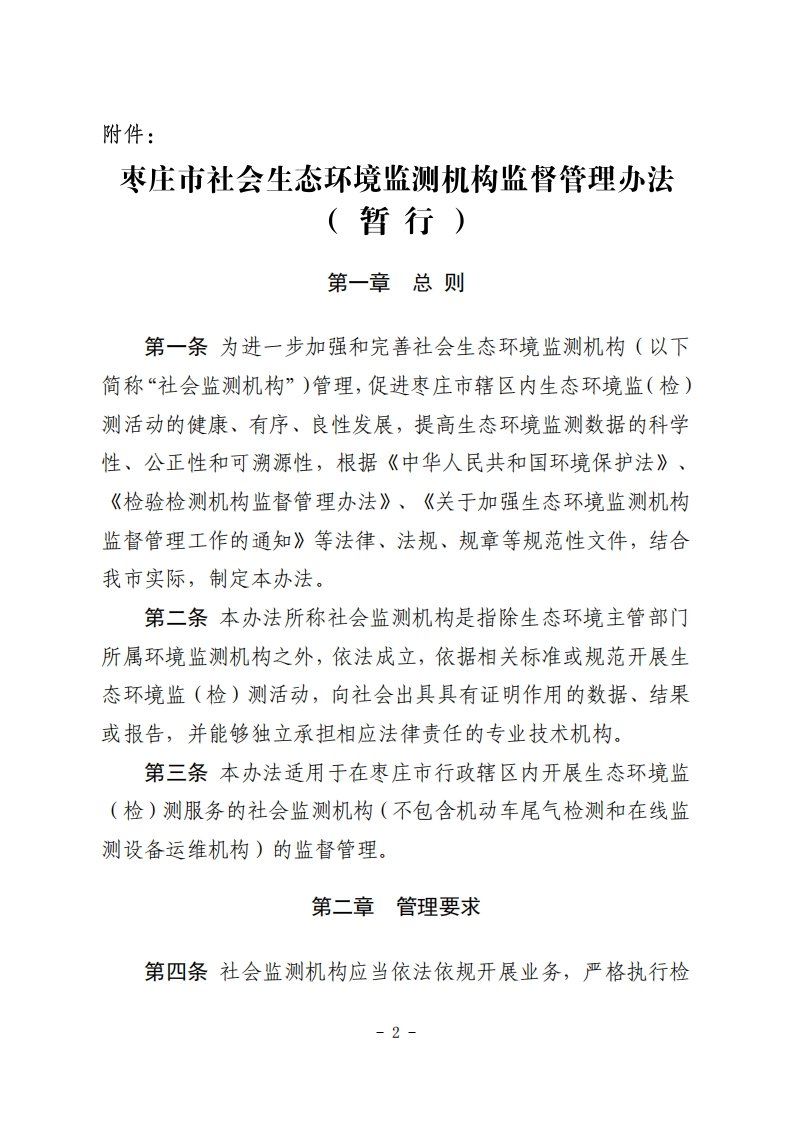 ZZCR-2023-0310001枣庄市生态环境局文件枣庄市市场监督管理局枣环字〔2023)53号关于印发《枣庄市社会生态环境监测机构监督管理办法(暂行)》的通知各生态环境分局、各区(市)市场监管局、高新区行政审批局、各相关社会化生态环境监测机构、各排污单位:为进一步加强和完善枣庄市辖区内生态环境监测工作,促进环境监测活动的健康发展,提高监测数据的权威性、公正性、科学性和可溯源性,经研究制定《枣庄市社会生态环境监测机构监督管理办法(暂行)》,本办法自2023年10月10日起生效,请各相关单位遵照执行。附件:《枣庄市社会生态环境监测机构监督管理办法(暂行)》态枣庄审市场督捏局003101532023年9月8日
