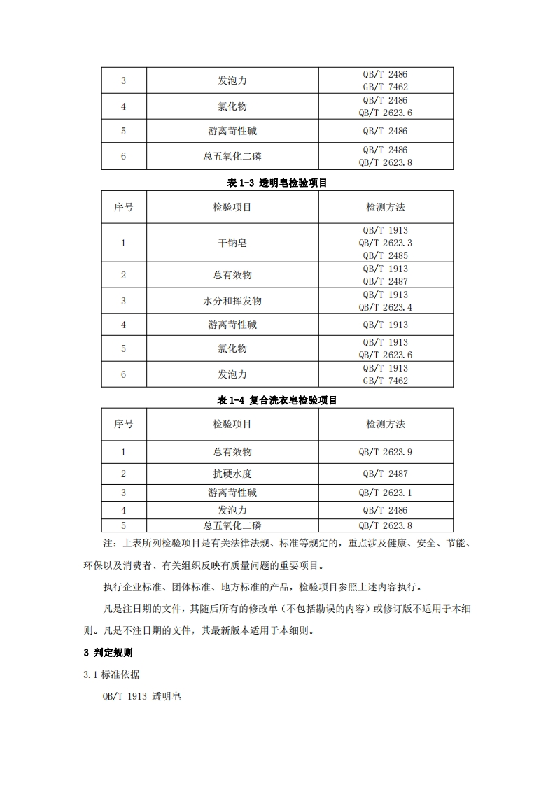 济南市皂类产品质量监督抽查实施细则(2025年版)1抽样1.1抽样方法以随机抽样的方式在被抽样生产者、销售者的待销产品中抽取。随机数一般可使用随机数表等方法产生。1.2抽样基数抽查样品基数满足抽样数量即可。1.3抽样范围随机抽取有产品质量检验合格证明或以其他形式表明合格的,近期生产的产品。皂类产品根据产品用途分类,抽查产品种类包括洗衣皂、香皂、透明皂、复合洗衣皂。1.4抽样数量每批次产品抽取样品数量不少于20块,且总量不少于300g,其中10块作为检验样品,10块作为备用样品。2检验项目及检测方法表1-1香皂检验项目序号检验项目检测方法1干钠皂QB/T2623.32总有效物QB/T2623.93水分和挥发物QB/T2623.44总游离碱QB/T2623.25游离苛性碱QB/T2623.16氯化物QB/T2623.67总五氧化二磷QB/T2623.8表1-2洗衣皂检验项目序号检验项目检测方法QB/T24861干钠皂QB/T2623.3QB/T2485QB/T24862乙醇不溶物QB/T2623.5
