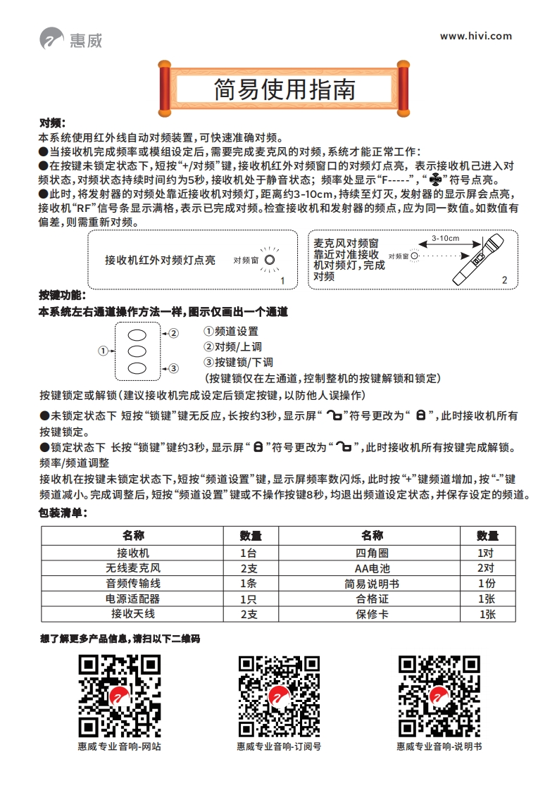 惠威www.hivi.com简易使用指南前面板/背板:①②④⑤⑥⑦⊙34①左通道音量加⑥红外对频窗口①天线接口(两条天线均需要安装,否则影响接收距离)②左通道操作按键⑦电源开关(或按键)②右通道XLR平衡音频输出接口③LCD液晶显示窗口⑧左通道音量减③直流电源输入接口④右通道操作按键⑨右通道音量减④左右混合6.35mm非平衡音频输出接口⑤右通道音量加⑤左通道XLR衡音频输出接口接收机显示屏:3RAUTE 000RAUTE 000①6CH88810⑨⊙①对频符号:闪烁表示接收机正在发射对频信号②接收到的音频信号大小的指示③接收到的无线信号强弱的指示④静音指示(包括未接收到信号、发射器关机等)⑤频道:本机属于频道调整优先,我们已经为每个频道设置了不同的频点,在多台设备同时使用时(如卡拉OK应用),根据接收机的放置远近,左右通道按顺序CH001-CH100、CH101-CH200调整即可。⑥采用真分集电路时两个高频系统的切换指示接收机工作时会根据前后天线的接收效果切换,“圆/国”会闪烁转换,指示正在采用的高频系统。⑦左通道频率/功能调整时显示对应的字符⑧右通道频率/功能调整时显示对应的字符⑨射频频率单位0按键锁①对应的发射器(手持麦克风)电池电量指示审温馨提示:关闭手持话筒后,RF无线信号条会没有信号。若F信号条仍有信号,请检查天线位置是否正确或场地是否存在其他干扰。