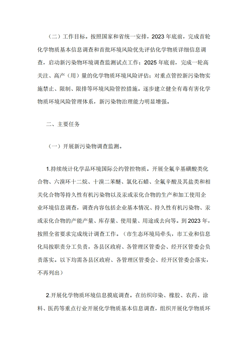 张家口市新污染物治理工作实施方案有毒有害化学物质的生产和使用是新污染物的主要来源。国内外广泛关注的新污染物主要包括国际公约管控的持久性有机污染物、内分泌干扰物、抗生素等。为贯彻落实《国务院办公厅关于印发新污染物治理行动方案的通知》(国办发〔2022)15号)和《河北省人民政府办公厅关于印发河北省新污染物治理工作方案的通知》(冀政办字〔2022〕159号)精神,深入打好污染防治攻坚战,加强我市新污染物治理,切实保障生态环境安全和人民健康,制定本方案。一、总体要求(一)指导思想。以习近平新时代中国特色社会主义思想为指导,全面贯彻党的二十大精神,深入践行习近平生态文明思想,认真落实党中央、国务院和省委、省政府决策部署以及市委、市政府工作安排,立足新发展阶段,完整、准确、全面贯彻新发展理念,统筹推进新污染物环境风险管理,实施调查评估、分类治理、全过程环境风险管控,加强制度和科技支撑保障,建立健全新污染物治理体系,有效防范新污染物环境与健康风险,以高水平保护推动高质量发展,创造高品质生活,为在中国式现代化新征程上交好高质量发展优异答卷提供有力支撑。