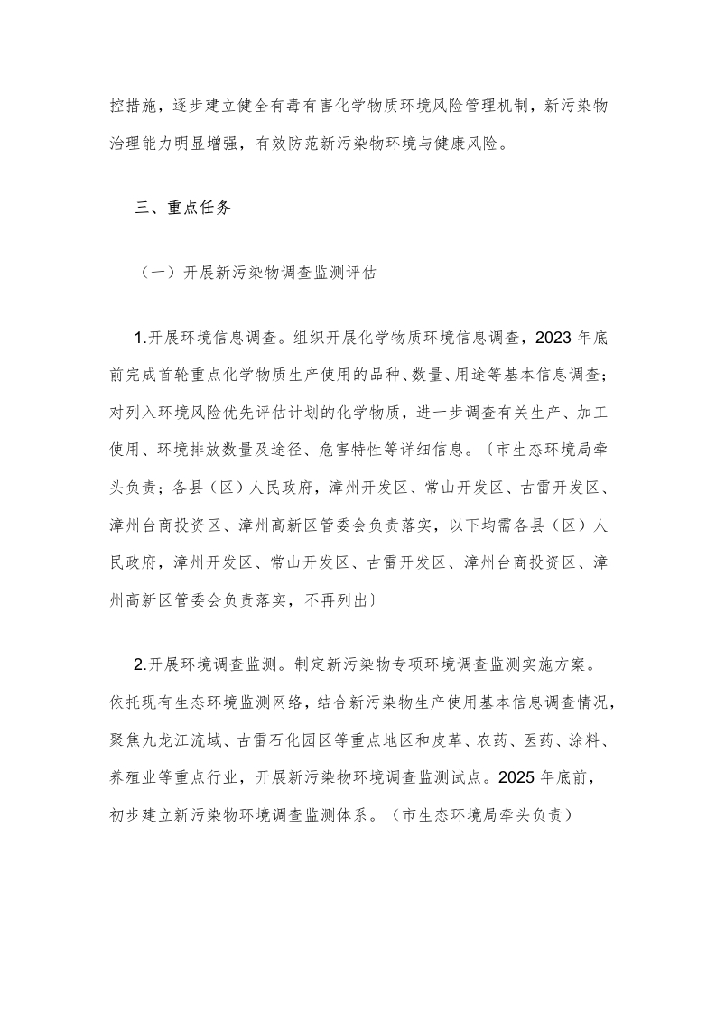 漳州市新污染物治理工作方案为贯彻落实党中央、国务院关于深入打好污染防治攻坚战的决策部署和省委、省政府工作要求,统筹推进新污染物治理,切实保障生态环境安全和人民健康,根据省政府办公厅《关于印发福建省新污染物治理工作方案的通知》(闽政办〔2023)1号)要求,结合我市实际,制定本工作方案。一、总体要求以习近平新时代中国特色社会主义思想为指导,贯彻落实党的二十大精神,认真践行习近平生态文明思想,以有效防范新污染物环境与健康风险为核心,以国家公布的重点管控新污染物清单为重点,建立健全新污染物调查监测、筛查评估、管控治理体系,落实全生命周期环境风险管理,统筹推动大气、水、土壤多环境介质协同治理,以更高标准打好污染防治攻坚战,加快建设富美新漳州。二、工作目标到2025年,完成国家和省政府重点管控新污染物环境信息调查、监测及环境风险评估,明确新污染物防控重点区域、重点行业、重点企业,严格落实重点管控新污染物清单的禁止、限制、限排等环境风险管