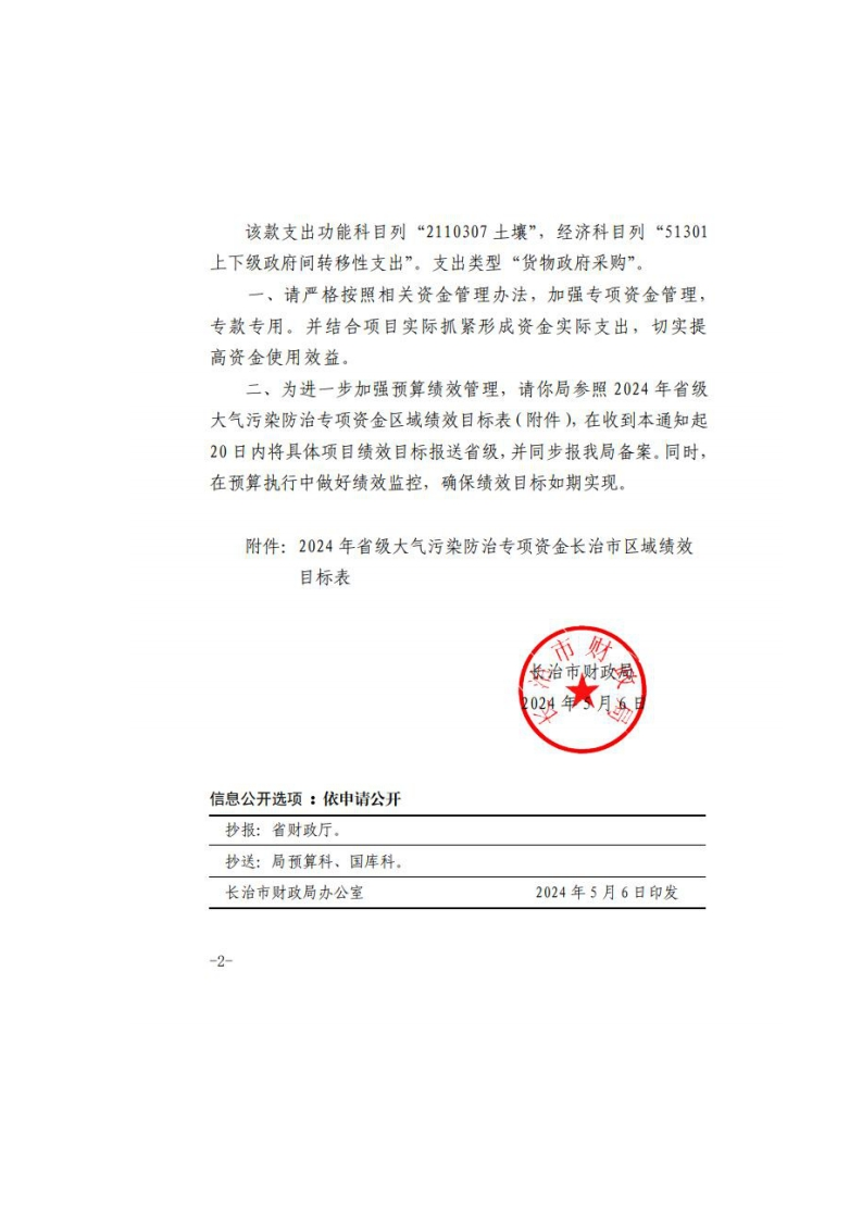 长治市财政局文件长财建二〔2024)53号长治市财政局关于下达2024年度省级大气污染防治专项资金的通知市生态环境局:根据《山西省财政厅关于下达2024年省级生态环境领域“一泓清水入黄河”项目资金的通知》(晋财资环[2024]43号)和《市生态环境局市财政局关于下达2024年省级大气污染防治专项资金的请示》(长环[2024]24号),经报请市政府批准,现下达你局2024年省级大气污染防治专项资金2502.9万元,专项用于我市11个县区27个乡镇空气自动监测站建设项目(晋环函[2024]235号安排建设任务)所需。-1-