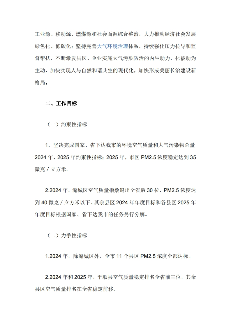长治市落实《空气质量持续改善行动计划》实施方案为认真贯彻落实国务院《空气质量持续改善行动计划》(国发〔2023)24号),持续深入打好蓝天保卫战,持续改善全市空气质量,切实保障人民群众身体健康,以生态环境高水平保护支撑经济社会高质量发展,根据《山西省落实<空气质量持续改善行动计划>实施方案》(晋政发〔2024)7号)要求,结合我市实际,制定本方案。一、总体要求以习近平新时代中国特色社会主义思想特别是习近平生态文明思想为指导,深入贯彻党的二十大精神,全面贯彻习近平总书记对山西工作的重要讲话重要指示精神,落实全国、全省和全市生态环境保护大会部署,牢固树立和践行“绿水青山就是金山银山”理念,坚持稳中求进的工作总要求,以改善空气质量为核心,以减少重污染天气和解决人民群众身边的突出大气环境问题为重点,以协同控制细颗粒物(PM2.5)和臭氧(O3)浓度为主线,统筹推进能源、工业、交通运输、城乡建设、农业等领域绿色低碳转型,协同推进降碳、减污、扩绿、增长,坚持管控治一体推进,以氮氧化物(NOx)和挥发性有机物(VOCs)协同减排为重点,不断强化多污染物协同控制:坚持精准治污、科学治污、依法治污,积极融入汾渭平原联防联控体系,强化科技创新,健全完善大气环境监测监控体系:坚持源头治理、系统治理和综合治理,持续实施