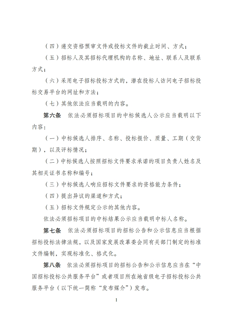 招标公告和公示信息发布管理办法第一条为规范招标公告和公示信息发布活动,保证各类市场主体和社会公众平等、便捷、准确地获取招标信息,根据《中华人民共和国招标投标法》《中华人民共和国招标投标法实施条例》等有关法律法规规定,制定本办法。第二条本办法所称招标公告和公示信息,是指招标项目的资格预审公告、招标公告、中标候选人公示、中标结果公示等信息。第三条依法必须招标项目的招标公告和公示信息,除依法需要保密或者涉及商业秘密的内容外,应当按照公益服务、公开透明、高效便捷、集中共享的原则,依法向社会公开。第四条国家发展改革委根据招标投标法律法规规定,对依法必须招标项目招标公告和公示信息发布煤介的信息发布活动进行监督管理。省级发展改革部门对本行政区域内招标公告和公示信息发布活动依法进行监督管理。省级人民政府另有规定的,从其规定。第五条依法必须招标项目的资格预审公告和招标公告,应当载明以下内容:(一)招标项目名称、内容、范围、规模、资金来源:(二)投标资格能力要求,以及是否接受联合体投标;(三)获取资格预审文件或招标文件的时间、方式;
