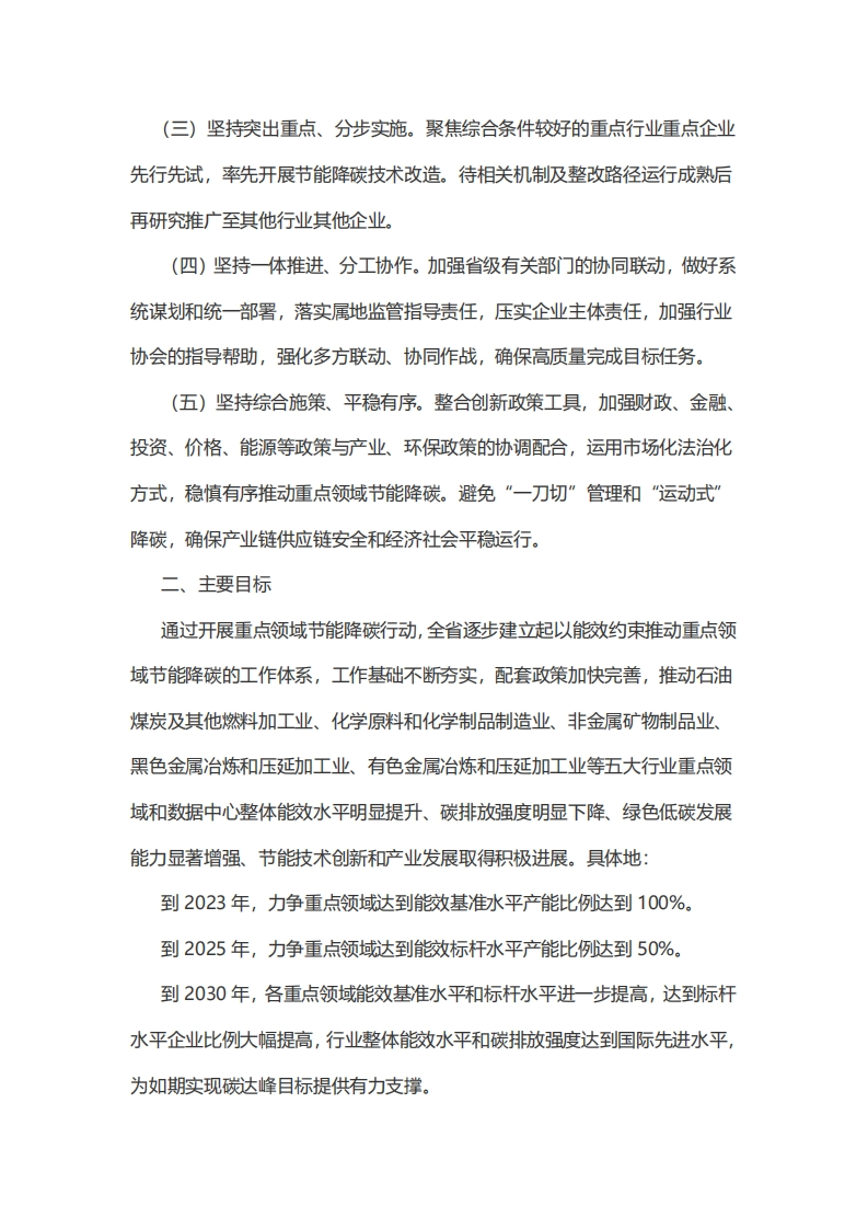 省发展改革委等五部门关于严格能效约束推动重点领域节能降碳工作的实施方案省科技厅、省财政厅、省广电局、省统计局、省大数据局、人行杭州中心支行、浙江银保监局、浙江证监局、省通信管理局,各设区市发展改革委、经信局、生态环境局、市场监管局、能源局:为深入贯彻落实国家发展改革委等五部委《关于严格能效约束推动重点领域节能降碳的若干意见》(以下简称《意见》)及《关于发布<高耗能行业重点领域能效标杆水平和基准水平(2021年版)>的通知》精神,推动重点行业加快低碳转型和高质量发展,针对我省石油煤炭及其他燃料加工业、化学原料和化学制品制造业、非金属矿物制品业(含光伏玻璃,下同)、黑色金属冶炼和压延加工业、有色金属冶炼和压延勁加工业等五大行业重点领域和数据中心,开展严格能效约束推动节能降碳行动,特制定本实施方案。一、工作原则(一)坚持能效好引领、统筹部署。深刻认识推动重点领域节能都降碳工作的重要意义,坚持把重点领域能效引领纳入全省碳达峰碳中和工作整体布局,坚持全省”一盘棋”,实干争先、加压奋进,统筹抓好重点领域节能降碳工作。(二)坚持对标标杆、整体提升。突出标准引领作用,对标国内外生产企业先进能效水平,确定各行业重点领域能效基准水平和标杆水平,以量化标准为牵引,推进开展节能降碳行动,助力全行业加快转型提升发展。