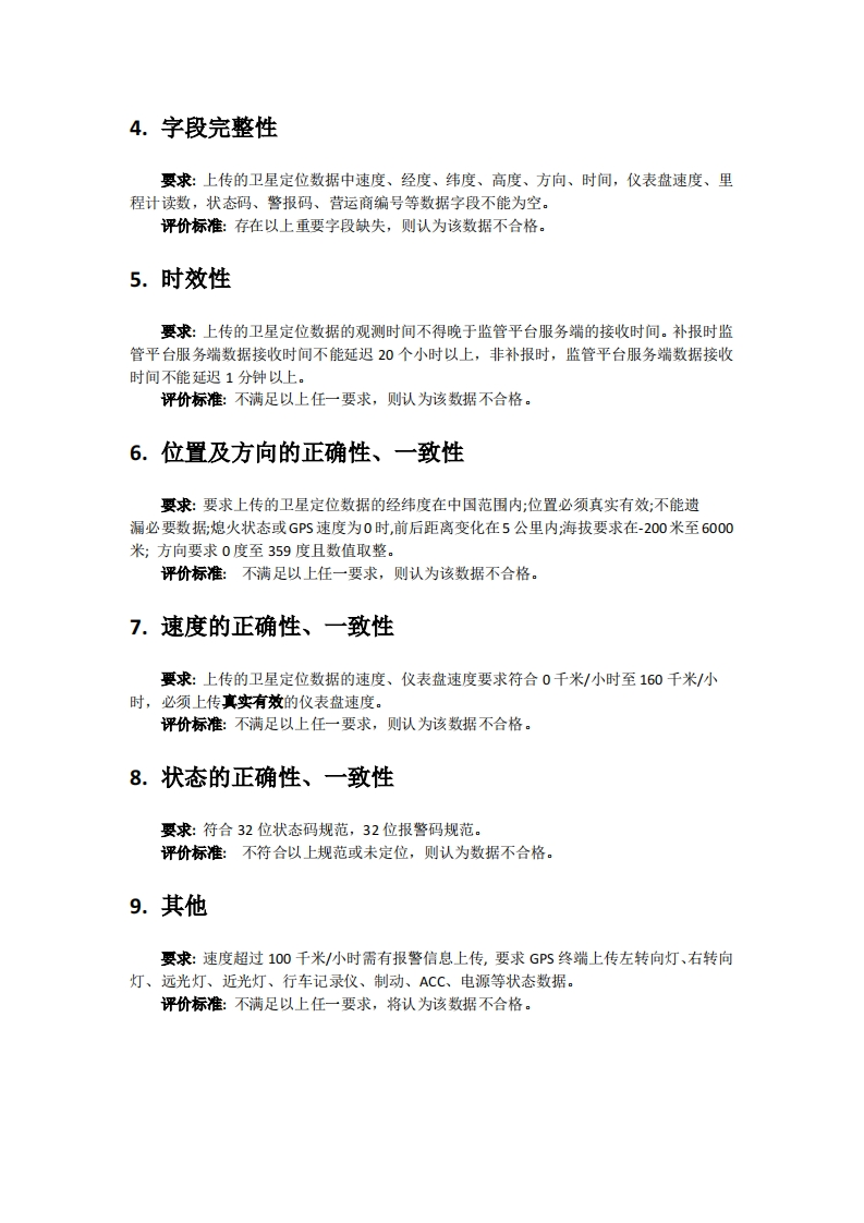 目录一、上传数据要求及评价标准.………emmmmmmm-mememmm-mmmmmme-1.上传资质………2.车牌号、车牌颜色.13.上传频率、数量.14.字段完整性………25.时效性………26.位置及方向的正确性、一致性27.速度的正确性、一致性.28.状态的正确性、一致性29.其他……2二、异常代码及说明……“3上传数据要求及评价标准1.上传资质要求:营运商只能上传获得两客一危经营许可,且授权服务的车辆的卫星定位数据,不得违规上传。评价标准:不满足要求的上传数据为不合格数据。2.车牌号、车牌颜色要求:车牌号:车牌号长度为7,第一个为‘浙’,并符合规则(如:浙A12345),不得出现#、*等符号。车牌颜色代码:限定为(1、2)。评价标准:不满足要求的上传数据为不合格数据。3.上传频率、数量要求:卫星定位数据上传间隔:在点火状态下,车辆上传间隔为每1530秒1条:在熄火状态下,车辆上传间隔为每14~16分钟1条。车辆熄火后终端至少需要传输2小时熄火定位数据。评价标准:计算不满足要求的程度,超过一定程度,则认为当天数据不合格.若当天上传数据总量少于60条或大于10000条,也认为当天数据不合格。(缺失的定义:点火状态下30秒以上未上传,熄火状态下16分钟以上未上传.冗余的定义:点火状态下15秒以内上传,熄火状态下14分钟以内上传)。