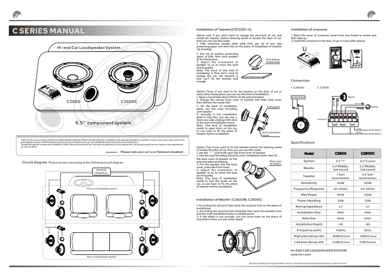 C SERIES MANUAL二,高音喇队安装CST225C.4引四。分频解安装安转方式一:妇不机空变车健有。将高自安限在食图查制方或室门1芳分自脑并罩打用。用方从局制肉由内按,然肠南上镜起,也,可日乘用世方式。之,特分得器家离在年门房发算结口置。Hi-end Car Loudspeaker System置程护相色情它尼在高宫附?的里装信四唐然所其可在球宽的位置多同塑刚南方向,以便达别理想的性:此特为挂氧点在于可以是全不对车速行空安;鼓海果琴满目率园玉、接线安精方式二:如果雪英真音安精在车门除其它隐装等管置,可利1.C00C2C6001,在透夏的看开一的为心m的西飞无C2600C2600C时盖团于酒形礼内。采在支餐制的青窗将得世穿建科用4保买阵情现,蜂果安装楼共胶调到可以先满力n单面自经V愁6.5"componentsystem注:特业器方五国看在率上们乱或在安病萌黑磷定肉音限即的凌14444444444成宝店喷《车用精声器系统有T量于您家来数量用,春们华写车新两。裤鼻记在密端之前,仔腰速汗用望丁解家满程丰及正直塞明,恋据平同型号的器酒福系线,至调不的霍是直又堂结方式三:置里率国地将典备堂结在权表鱼轴内壁车门如同以风用六,规格参鞋品城中析西明州了安南的方武,雷司时于汽年餐洲开最有作顺,感爱有食为的悦始,通干舞自行女满,号习以表有悦地的调场秀此进写酒水一情特别注身您的汽车处手地火状迹引明盖门开.■号C2600C2600c一、线路图;请孩聚以下线洛图连递黑粗,特高昌南的色温锁署在系精阳威65"+P65阿移■的位西3特南入后盖为、压紧盖中备雪65中活音5中目留4.可擅喇肌的方肉。以便结到理想高留“获球顶高冒Q8歌球项真音所鲁挡果:种方在车上世,只酸监90890dB在业端射完确室离商机的家装住频奉确应60-206H260-20*H%品大动军20情103w额爱约军50同50W三、任音制1安装C2600W,C2600C)酸宏用收的40家福凡中0858165开孔凡时的44044工安装度平够时,屑在两所装如一胞以加安装深度家浩灵留65365分桶点453在5XKHr000高透复线鲜半-1dB/O:tave-BdB/Dctree任通复减料率-12dyOctavewww.hivi.com