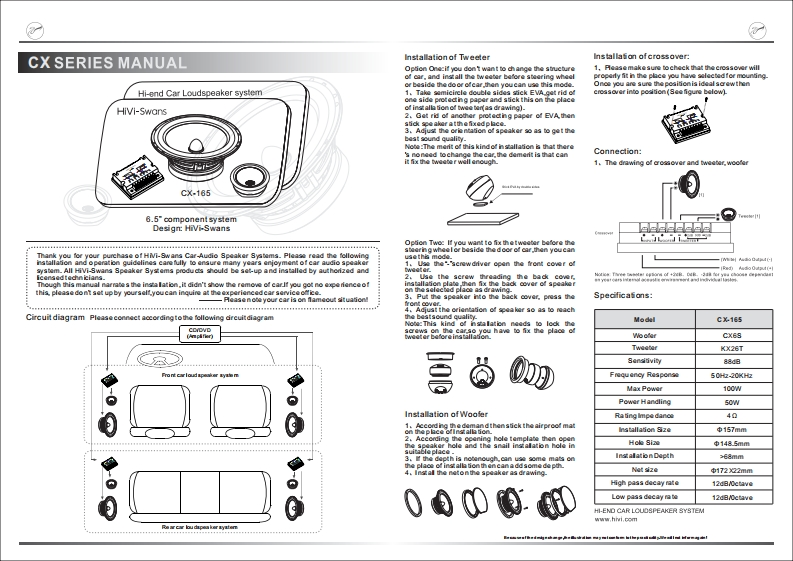CX SERIES MANUAL二、高音喇肌安装四、分频得安装:安装方式一:妇不想改变车结构,将离商安装在仪表盘1,在车门或其他棕想安装的地方确定安装位置.议不影响其前为或车门边,可议采用此为武:它幕分为准然后将分音器用螺丝国定在上真如下图:1.取率罗那双面白帖日VA,去除一面保护纸后将它帖在Hi-end Car Loudspeaker system离高喇机的安装位(知的,2将自E风的另一面保护纸去除,然后将喇界帖在选HiVi-Swans定的位置:3博整喇机方向,以便达到理想的所音效果。进:数种方武优点在于可似壳全不对车进行改变:缺点是不能视牢出的送定离音,五、接线方法:1,分领器与离音:低在连接示意留CX-16585”c0 mponent$s想mDesign:HiVi-Swans安装方式二:要想牢国地将离高安装在仅表查前方或车门边,可议采用此种安装方武。1:先用·一字”螺世刀璃离音喇乳的前盖打开,欢您适购喇感车用橘声器系统为丁便于您的安装及使用,贵们编写本析页。请务必在安装使用之前,仔短烫2按留示将安装螺性麻过后盖,安装根,将离音喇肌的后盖镇需在选取的位置。您可似去有经老的汽车程务处进行青询。3肌装入后内压前面超镜人年请特制进您的汽车处干熄火状恋!4请整喇乳的方向,以便达到理想的用音效果。逢:其种方式需在车上镇螺丝,蚊在安装前确确定离音喇正:离青银什可以想代车内韩情调现个人车解酸室为十+我温、■三补社店一、线路图:请按技湘议下线蹄雷连接乳的安装位置:六、规格:汽车■号CX-165中低音CX6S离音26T灵敏度88u日须率响应50H2-2C0Hz三、低音喇肌安装最大功率100w1。依实际需要将密时垫片贴于喇乳的安装位,额定功率50W2将装年网的网板除,螺世穿过装锋网型料件及喇乳安额定阻抗40装孔将喇环镇需:3当安装深度不够时,可似在喇乳的安装位加一垫瓶风安装民寸中157mm增加安装深度:开孔尼寸中1485m4将网按智示装于喇乳上。安装深度>68mm网尺寸中1723X22mm离通来液料率12d日/0 ctave低通来减料率12d日0 ctave惠酸车用扬声器系纸www.hivi.com·车和后相音响系统”