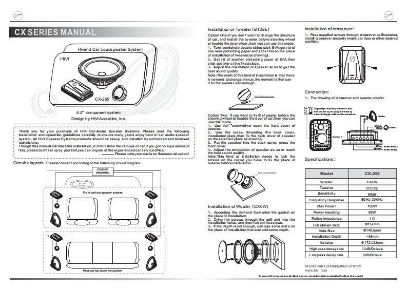 CX SERIES MANUAL二、高音喇肌安装(BT28曰四、分频得安装:安装方式一:如不想政变车结构,将离音安装在伐表值1,按图示将安装螺世过分须器,将分须器镇亲在车门内前方或车门边,可议采用其方式,或其他选定位置,Hi-end Car Loudspeaker System1。取半要形双面白帖日VA去除一面保护纸后将它粘在离音喇乳的安装位(如的,H2将白炬风岭男一面保护据去除,然后璃喇乳粘在透定的位置:3情整喇乳方向,以便达到理想的雨音效果。进:此种方武优点在于可议完全不对车进行改变:缺点是不能澜牢国的国定离音。联画自移EM五、接线方法:CX2651,分须器与离音。低在连接示意雷。6.5*component system安装方武二:要想牢国地将离音安装在仪表查前方或车Design by HiViAcousics,Inc.门边,可议采用此种安装方式:1,先用·一字”螺丝刀将离音喇乳的前盖打开,■■■2按雷示将安装螺世麻过后盖,安装根,将离音喇乳约欢烧选购咖破车用橘声器系统,为丁便于您的安装及使用,费们编写本析页。请务论在安装使用之前,仔操螟声器后盖镇亲在选取的使置,将喇乳装入后盖内:压需前盖:您可似去有经老的汽车程务处进行青询。4请整喇乳的方向,以便达到理想的所音效果。请特制进意您的汽车处干熄火状恋!注:其种方式需在车上镇螺地,蚊在安装前确确定离音喇乳的安装位置:一、线路图:请按湘议下线蹄雷连接六、规格:汽车型号CX-265中低音CXEW离音日T28E灵敏度88d日装率响应50位-20KH也三、低音喇肌安装(C8WM最大功率100W1,依实际需要将密时垫片站于喇肌的安装位,裂定功率50W2螺丝麻过装饰网及喇肌安装孔将喇肌镇需:3当安装深度不够时,可仪在喇机的安装位加一垫烟议额定阳抗40增加安装深度,安装尺寸中157mm开孔风寸中14&5mm安装深度368mm000网单尺寸中172X22mm离通来液料率12d日0ca0低边来减料率Ed日0 ctave由后车用总唐惑系切www.hivi.com·车和后相音响系统”