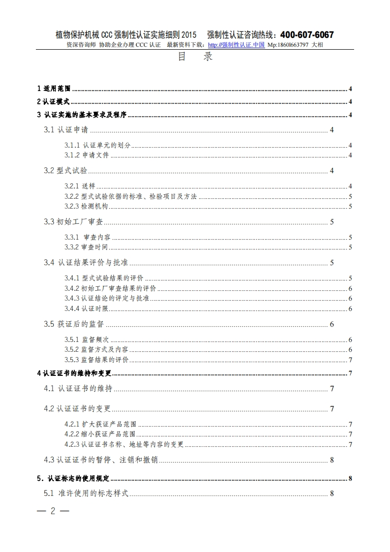 植物保护机械CCC强制性认证实施细则2015版348072@abc4个月前发布关注私信0.34MB13页048植物保护机械CCC强制性认证实施细则2015版此内容为付费资源,请付费后查看¥12¥22黄金会员免费钻石会员免费立即购买您当前未登录!建议登陆后购买,可保存购买订单付费资源 第1页 / 共13页 第2页 / 共13页 试读已结束,还剩11页,您可下载完整版后进行离线阅读 THE END标准规范 文本预览 植物保护机械CCC强制性认证实施细则2015强制性认证咨询热线:400-607-6067资深咨询师协助企业办理CCC认证最新资料下载:hp:强制性认证中国Mp:18601663797大相附件2:编号:CNCA一05C—029:2006农机产品强制性认证实施规则植物保护机械2006-08-15发布2006-12-01实施中国国家认证认可监督管理委员会发布1 查看更多 收起部分 喜欢就支持一下吧收藏
