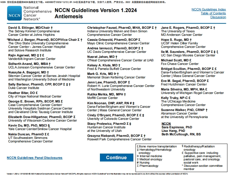 00提权医林通提供00划指南全文下数,400000于2023/12/22的:54在医1珠通平台下数,仅供个人使用,户慧分发.222美四回家综合墙面网锋板权所有,National ComprehensiveNCCNCancer NetworkNCCN Clinical Practice Guidelines in Oncology(NCCN Guidelines)AntiemesisVersion 1.2024-December 13,2023NCCN.orgNCCN Guidelines for Patients available at www.nccn.org/patientsContinue