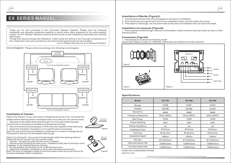 EX SERIES MANUAL三、低音喇安装(如下团3):1、依实标需要将密封垫片贴于喇肌的安装位。2螺触穿过装锋网及喇肌安装孔锦喇肌镜解3、当安装深度不锦时,可似在喇肌的安装位组一垫国似增如安装汉度发迎修选购唐藏车用绩声器系统。为了侵于您的安装及使用,氏编写本折页。满务论在安餐使用之前。仔组风使并清楚丁解安装程序及注意事项,依据不同型号的场声器题统,采用不同岭安爱方式。四、分频器安装如下图4》:显然本桥页悦钥了安蒙的方式,但是对于汽车拆繁并经有作说明,图如必经有止方正的经恰,请不要白行安装:1、估图示济安装螺丝穿过分频器,济分频器镶景在车门内定其使选出位置您可以去有经验的汽率图务处进行咨汽,一清样期准意绝的汽车处干地火状态!五、接线方法(如下图5):年年形行卡卡年带彩卡卡市年带彩卡卡卡年形无卡市年有书卡卡卡卡年原有无市等卡书手带有卡年书无卡卡等参卡书市带彩卡卡卡年彩书卡有年带彩卡卡市年带彩卡卡市年有卡市卡年形书卡卡原彩书年等有无有年卡卡年1、分凭器与查音、低盘连接示意图。一,线路图:请传预以下性善图速接注,傲个人喜好将高音调节为“28、0B、2妇”三种状态CTD高边地00000HV-5voms分塑图高音⊙高音明高音明音明85分频分大、规格:铁音明音刚乳■号EX-165EX-260Ex-265中低音EX6BEX6FEXBS高音DX28BDX288KX26T灵触度8BdB88dB88dB频卓响应SOHz-20KHz50Hz-20KHz50Hz-20KHz二,高音喇从安装量大功军100W100w100W方式一知图1:如不想改变车结构。蒋高音安缓在仪表盘前方威车门边。可以采用比方式额出功率50W50W50w1,取平圆形双面自粘EVA去除一置保护纸后算它黏在高音到肌的安装位(如。2,将白粘EA的另一面保炉组去除。然后将刚肌粘在选志的位置。制定阳抗4040403,利整喇以方向。以便达到理想的所音效暴,安装尺寸中157mm中157mm◆157mm图1注:此种方式忧点在于可议老全不对车进行成安;缺点是不能视牢国的国定高音。开孔尺寸中148.5mm中148.5mm电148.5mm方式一知图:要想军国粒将高音安暴在饮表盘前方威车门边。可以果用比种安装方式安结深度≥68mm≥88mm≥68mm1,先用“一字”锯丝刀将高音酬队的前透打开,网单尺寸中172×22mmD172×22mm中172X22mm2,按图示将安装螺拉年过岳盖,安装板,将高音喇叫的后盖销候在莲取的位置高通袁减料率12dB/Oclave12dB/Octave12dB/Octave3,将喇以美入后盛内,压紧前盖,低酒童减料率12dB/Dotave12dBiOctave12dB/Octave4,到整刚明的方向。以便达到理想的所音微黑,注:北种方式需在车上领望址,校在安装前须确定高音喇明的安装位置墨感车周温声落系控图2www.hhi.com