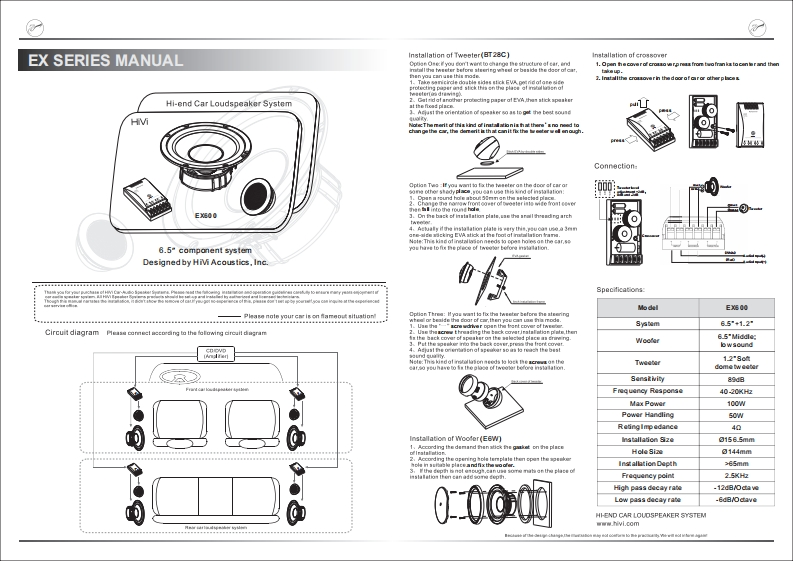 EX SERIES MANUAL二.高音喇机安装阳T28C:四。分频器安装安装方如不想五变车售构。高高音安第在管表叠前方城车门Hi-end Car Loudspeaker SystemHNVi五:接线方法:空言方式二:如果苦将鹰音喇氧密言在有门成林它位面纳他置,可1,分拜酒与高音,展香蓬怪尽意图E据00文种安是方火需要在车上乳,岭在安丽确高音氧的6.5°component systemDesigned by Hi Acoustics,Inc.盖每鱼入十,用影彩■有彩形用影彩形影■用用至时整国刻本钠言显明7应经解有或后金时干我在餐经料漫看作候调。■恒里量有其有国的晚也。请千要自开烫留。多网已会海桥世的汽金国务黄湖作活海。要国室离在表方车门由:可日★,规格一请特别注意您的汽车处于境火授恋2.■号EX600线路图:满按雨以下线骑图连接W场祛收种方大黄在衣上的球营,被在业独的宝说症高音州力安云系统组娱65'+1.2"中低音65中低音离音12"较球项离音贝敏度89d日须率响应40-20%位最大功率100W积定功率SOW三,低音喇凯安装E6W0:服定阻抗401,使实标苦面将堂柱座片松干利职的安第拉:安装尺寸@1565mm工爆推穿理制所安装孔将剩所锁紧,条,春安累家度不藤时,可对在明职的安服植加一整雨日境如灵第闲开孔风寸@144mm安装深度365mm分颗点2.5KH位0000离通来减料率.12d日0daw低通来液料率-6d日odae赞军用品西器新织www.hiw.com