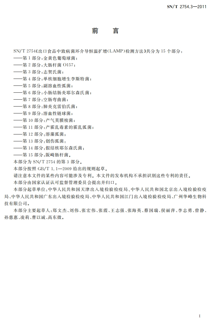 SN中华人民共和国出入境检验检疫行业标准SN/T2754.3-2011出口食品中致病菌环介导恒温扩增(LAMP)检测方法第3部分:志贺氏菌Loop-mediated isothermal amplification detection method for pathogensin export food-Part 3:Shigella2011-02-25发布2011-07-01实施中华人民共和国国家质量监督检验检疫总局发布