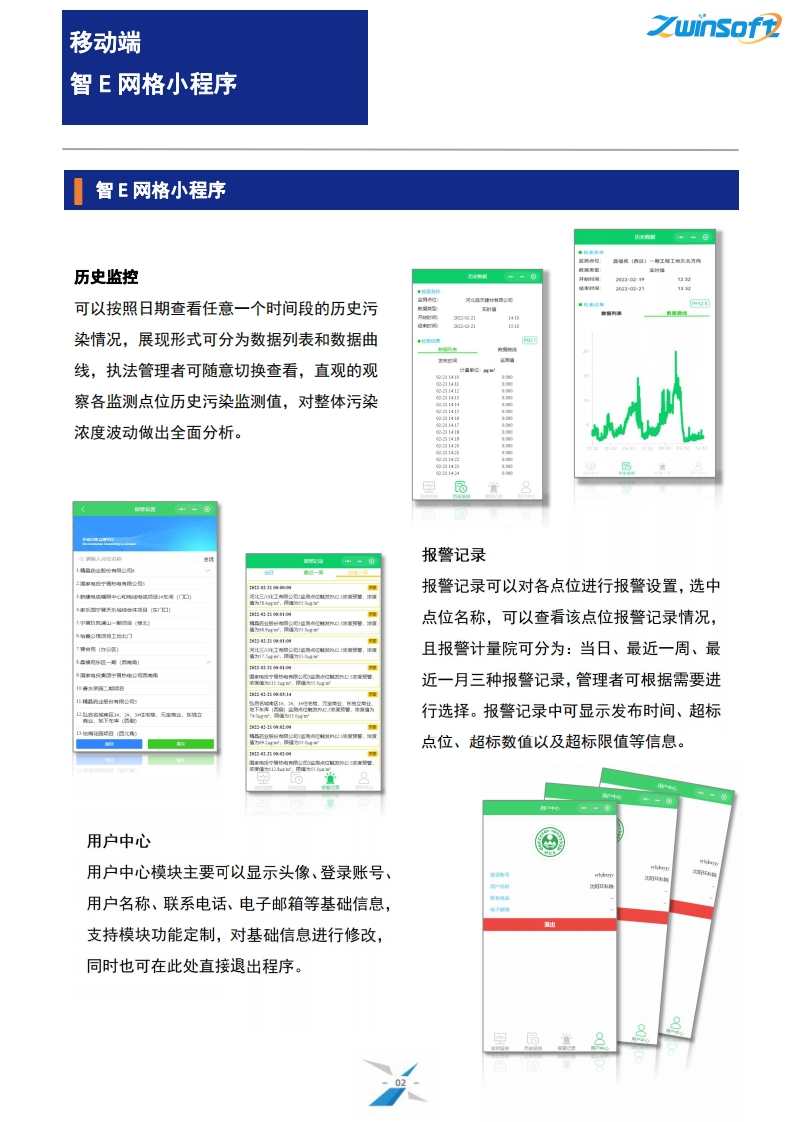 移动端之uinsof智E网格小程序智E网格小程序移动端用户可根据不同权限账户登录小程序后查询,主要展示所有监测点位的实时位置、各监测因子数值,及时准确接收主研发改善空气质量对颗粒物污染程度实时监控的解决方案,通过远程数据监测系统对污染区域实现实时有效的监管,将污染区域所采集的数据进行分析、整理,以报告、报表的形式展示,支持导出留存凭证及提供数据基础,清晰明了,将监测区域纳入监管范围,真正实现有效管理和标准化执法。历史酸据查询数据查看与分析环境质量指数排名查看系统设置功能标准用户权展控制用户权限控制GS地理信息显示功能模块实时监控展示支持动态图、折线图、柱状图形式,展示的内容为各项监测因子浓度的实时与历史分钟值、小时值,方便用户查看时间段内各项监测因子(PW2.5、PW10、S02、N02、C0、03等)变化趋势,同时可以进行监测点位之间的各项参数的对比、同比、环比分析。