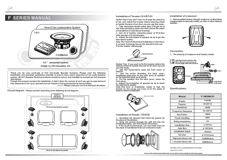 F SERIES MANUAL二、高音喇肌安装K26TS四、分频得安装:安装方式一:如不想改变车结构,将离音安装在伐表值1,按图示将安装螺世过分须器,将分须器镇亲在车门内前方或车门边,可议采用其方式。或其他选定位置,Hi-end Car Loudspeaker System1。取半要形双面白帖日VA去除一面保护纸后将它粘在离音喇机的安装位(知的:HiVi2将白炬风岭男一面保护据去除,然后璃喇乳粘在透定的位置:3调整喇乳方向,以便达到理想的用音效果。进:此种方武优点在于可议完全不对车进行改变:缺点是不能澜牢国的国定离音。联画自移EM五、接线方法:F1600MKIII1。分须器与离音。低在连接示意雷。6.5*component system安装方武二:要想牢国地将离音安装在仪表查前方或车Design by HiViAcoustics,Inc.门边,可议采用此种安装方式:1,先用·一字”螺丝刀将离音喇乳的前盖打开,■■■2按雷示将安装螺世麻过后盖,安装根,将离音喇乳约欢烧选购喇威车用橘声器系统,为丁便于您的安装及使用,费们编写本析页。请务论在安装使用之前,仔操螟声器后盖镇亲在选取的使置,将喇乳装入后盖内:压需前盖:您可似去有经老的汽车程务处进行青询。4请整喇乳的方向,以便达到理想的所音效果。请特制进意您的汽车处干熄火状恋!注:其种方式需在车上镇螺地,蚊在安装前确确定离音喇乳的安装位置:一、线路图:请按湘议下线蹄雷连接六、规格:汽车型号F1600MKII中低音FEW■离音KX26T-8灵敏度88d日装率响应63-20KH也三、低音喇肌安装(F8M)最大功率100w1,依实际需要将密时垫片站于喇肌的安装位,裂定功率0W72螺丝麻过装饰网及喇乳安装孔痛喇肌镇需·3当安装深度不够时,可仪在喇机的安装位加一垫议额定阳抗40增加安装深度。安装尺寸◆157mm开孔风寸◆1485mm安装深度》6Emm0000网单尺寸◆172X22mm离通来液料率12dB/Oct ave低边来减料率EdB/Odtave由后车用总唐惑系切www.hivi.com·车和后阳音响系统”