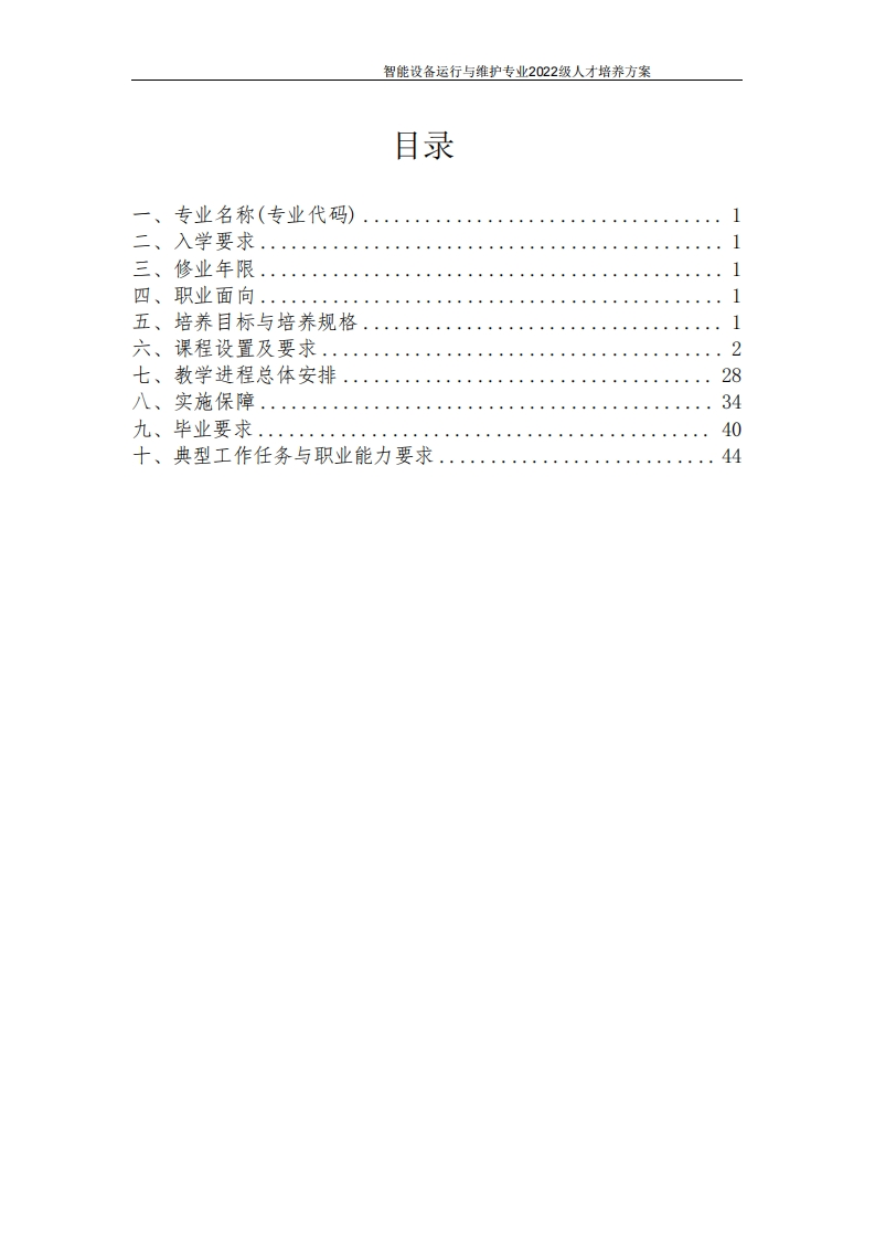 智能设备运行与维护专业2022级人才培养方案智能设备运行与维护专业2022级人才培养方案(2022年9月修订)专业名称:智能设备运行与维护专业专业代码:660201隶属系部:XXXX系隶属专业群XXXXXX专业群专业群负责人:XXX专业负责人:XX修订日期:2022年9月专业人才培养方案编制团队成员名单序号姓名工作单位职称/职务任务分工XXXXXXXXX教授/教师统稿,组织协调XXXXXXXXX副教授/教师调研分析,撰稿XXXXXXXXX讲师/教师调研分析,撰稿XXXXXXXXX讲师/教师撰稿,校对XXXXXXXXX讲师/教师对接企业需求6XXXXX有限公司校企合作专员校外专家,顾问7XXXXX有限公司设备管理部部长调研分析,撰稿