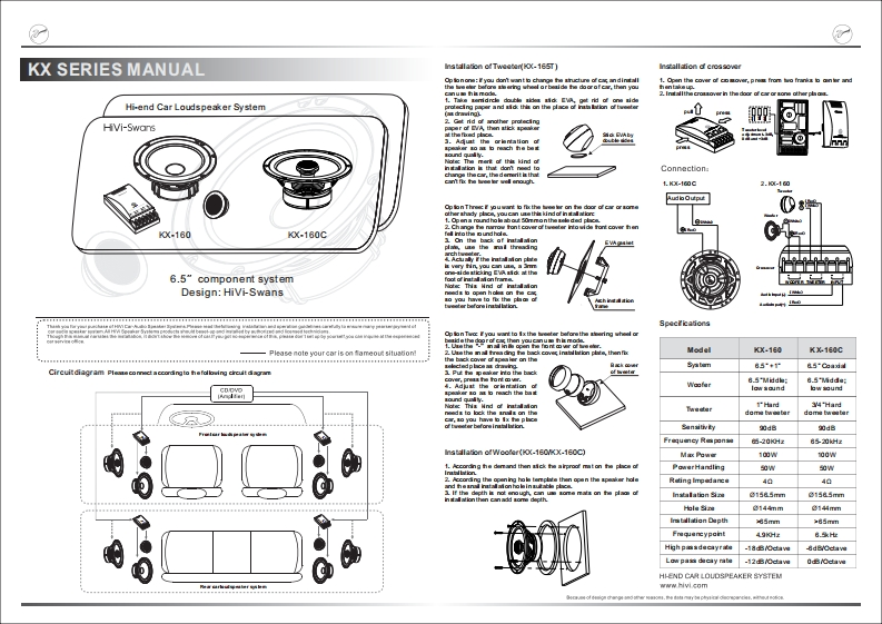 KX SERIES MANUAL二.离音喇乳安装(X.165T)石。分须器安装瓷有轻生是文车听。将高自爽装箱饮肉盒前方在门1.移分自器外军打开,用力从满侧肉会内装汽,然面肉上是起工移粉频器卖装在车门内碳其物信置,1草卡圈限缤密每店E风,表陈一Hi-end Car Loudspeaker System费君5它市离在利的2移有虹V的男密保的梁表陈HVi-Swans辅后移南新结存支的信置。餐保精团的国克高五:接线1.KX-160C2.0-10卖装方式二:如果密将高喇所安装在车门其名隐能的粒置,可留周81.在更的信置开一钩加0mm的0X.160X-160C高唐卖装架镇紧所。4禁卖即情视、,如果安装餐气较速时可型先和m单老有C/因6.5"component system注:方要在车上打孔Design:HiVi-Swans4海)南华)11119919099011999999999mm1 mm7 Pmmn717mm7117mm77m11m27右是家动内来道用保西语系用。为了便于家有安民贝使用,有有写本有胃。国务中安需文新。甲调法湖数了相肉架型中贝准京理,事烟不肉装方或不,要想率国地化高音安装在管表在前方成车门边可职需用六。规植此种安方武1先用“一字刀将高请特别进摩您的汽车处干想火状恋」的前盖打:■号0X-160K%160C2.病围果将安装爆推穿理质盖,安一。线晴图:请按强以下线图速援语的叠物的前省聚在系镜短城8.5◆8.5调轴中餐看85中经音85中任看4调想喇所的方肉,配领随司想禹香1球两晋3件装球质高看在安时到克满#南州的安格注,此种方式密在车上轴绿州,的具戴复90180d8桶重响85-20比85-20比最夫功重100W1的W三.低音刚乳安装(KX.160KX.160C)系定地军50wS0W系定厢抗40402眼性年理装第型料件层喇所安装孔将所销紧:变装尺寸.5mm@1565mm工当安装深度不中到,可家在制的安装信如一些湘家端如卖装深度:开礼尺寸144mmi4制mm安装深观mm5mm见分频点4.9州z8.%比离通豪戒料重.dB/Ocave8dBed山vm低通素戒料重-位dB/Octav0B枪山w明唇军用基西器新铜www.hivi.com