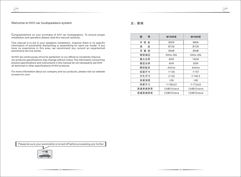 惠威车用扬声器系统(M SERIES MANUAL)M惠威美国HiM Acoustics.he.11530 Goldring Road Arcadia.CA 91005.USATCt+162还9300606F33+16269300E09HM惠威中国珠海惠感料技有限公同广东珠海市联速工业区大林山片区东成路南1号电话:07566263035传离:07任-6正80066268052客户服务搞线:40002091e产品说明书www.hivi.com来因设计变更等原因,所示资料可能与实物不符,想不另行通知。Due to the re asons in thechange of design or others.productin formation contained here may not bein contomity with prod uctitse.We reserve theright of no prior noticebefore change