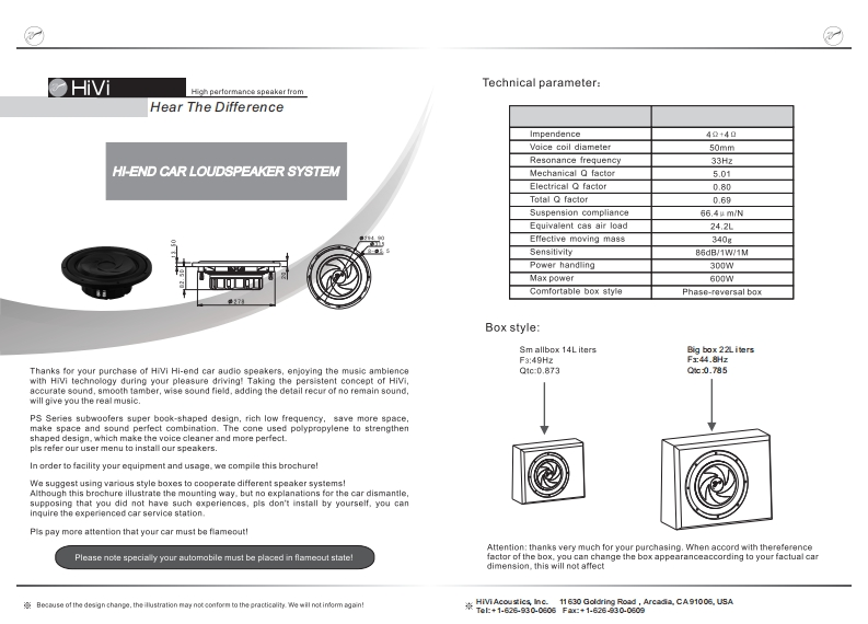 rHiviHich pertormance speaker from规格◆数Hear The Difference镇定阻抗4n+4n音圆直径50mm谐扳频宰33Hz夏腿车用超低合品西圆机辅植5.01电0值0.80HI-END CAR LOUDSPEAKER SYSTEM总0值0.69顺性66.4ym/N等效客积24.2L振动质量340g灵敏度86dB/1W/1M盈定功率300W最大功率600W适合箱体类型封闭箱使用箱体类型:1.小箱体2.大箱体Ps12:推荐箱体净容积:14LP312推荐箱体净容视22LF3:49HzF3:448Hz日、感谢阁下购买惠威车用超低音扬声器,在愉快的驾驶中享受惠戚科技0如:08730c0.785子构建的音乐氛围,秉承惠威一贯的Hi-En理念,声音准确,音色回涧,声场宽阁,低音强劲,加上毫无保留的细节重现,让你感受真正车音乐的体验,b、PS系列超低音扬声器采用电声科技超簿形设计,在能够获得理想低频效果的同时,更少的占用车内宝贵的空间,达到音效与空间的相互结合振膜采用高分子复合声学专用材质和特殊纤锥复合而成,声学工艺的结构设计,使低音更有质感,还原更出色,c,为了便于您的安装及使用,我们编写本手册。d、虽然这本手册说明了安装的方式,但是对于汽车拆装并没有作说明,假如您没有此方面的经验,请不要自行安装,您可以去有经验的汽车服务处进行咨询,日,根据不同型号的扬声器系统,我们推荐使用不同的箱体类型,请特别注意您的汽车处于熄火状态!注:事常感谢阁下的惠顾,在箱体内客积满足参考值的情况下,可极据实际车身尺寸改变箱体外孕不影响声频重放.请阁下放心使用。因设计变更馨原因,所示黄料时健与实物不粉,忽不另行通知,sBaaCiedsgnchang,theUhalanm时necomtomtohteractkai.wwilnti肉mgan查连清惠技有限公司。广东省珠海市联港工业区大林山片区东成游南1号电话:0756-6268035传真:0756-6268006.6268052