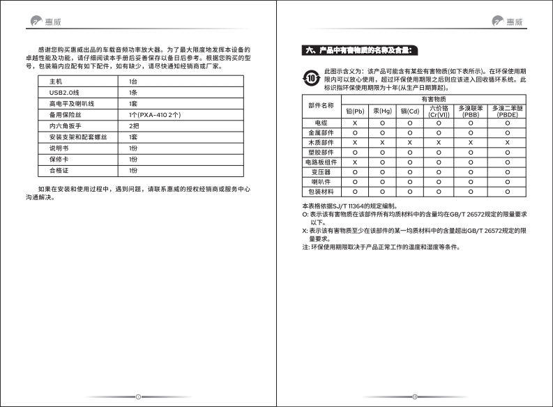 只数只可这塑惠威车载数字信号处理功放www.hivi.com(PXA SERIES MANUAL)Hi-ResAUDIOSWAN PXA-410/PXA-600/PXA-800/PXA-800 Pro设计Digm:惠减刺适商anufacturer:珠海唐感料技有刚公可地址Ades:珠海市联工业区东成路南1号电话Tel400-090-919的产品说明书因设计度更等原因,所示资料可能与为物不符,朝不另行通知Due to the reasons in the change of design er others,product information contained here may nat bein conformity with product itself.We reserve the right of no prior notice befare change.