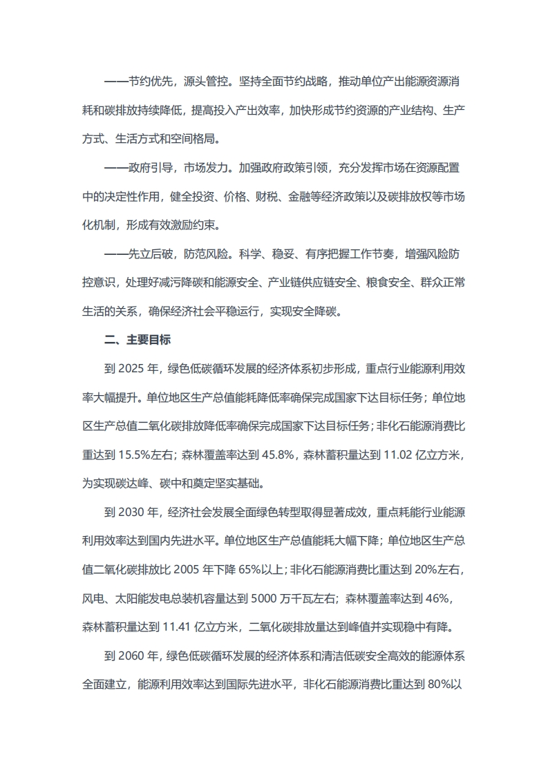 中共吉林省委吉林省人民政府关于完整准确全面贯彻新发展理念做好碳达峰碳中和工作的实施意见实现碳达峰、碳中和,是以习近平同志为核心的党中央统筹国内国际两个大局作出的重大战略决策,是着力解决资源环境约束突出问题、实现中华民族永续发展的必然选择,是构建人类命运共同体的庄严承诺。为深入落实党中央、国务院决策部署,完整、准确、全面贯彻新发展理念,做好我省碳达峰、碳中和工作,现提出如下实施意见。一、总体要求(一)指导思想。以习近平新时代中国特色社会主义思想为指导,全面贯彻党的十九大和十九届二中、三中、四中、五中、六中全会精神,忠实践行习近平生态文明思想,把握新发展阶段、贯彻新发展理念、构建新发展格局、推动高质量发展、促进共同富裕,坚持系统观念,处理好发展和减排、整体和局部、短期和中长期的关系,深入实施”一主六双”高质量发展战略,全面建设生态强省,把碳达峰、碳中和纳入全省经济社会发展全局,以经济社会发展全面绿色转型为引领,以能源绿色低碳发展为关键,着力构建清洁安全高效能源体系,促进生产和生活方式绿色化变革,坚定不移走生态优先、绿色低碳的高质量发展道路,确保如期实现碳达峰、碳中和。(二)工作原则一一系统谋划,统筹推进。坚持全省一盘棋,强化总体部署,发挥制度优势,实行党政同责,压实各方责任。鼓励各地区、各领域主动作为,因地制宜,分类施策。