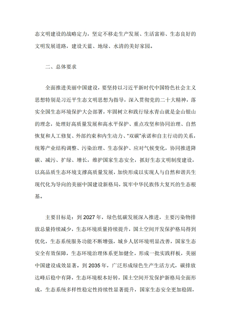 中共中央国务院关于全面推进美丽中国建设的意见(2023年12月27日)建设美丽中国是全面建设社会主义现代化国家的重要目标,是实现中华民族伟大复兴中国梦的重要内容。为全面推进美丽中国建设,加快推进人与自然和谐共生的现代化,现提出如下意见。一、新时代新征程开启全面推进美丽中国建设新篇章党的十八大以来,以习近平同志为核心的党中央把生态文明建设摆在全局工作的突出位置,全方位、全地域、全过程加强生态环境保护,实现了由重点整治到系统治理、由被动应对到主动作为、由全球环境治理参与者到引领者、由实践探索到科学理论指导的重大转变,美丽中国建设迈出重大步伐。当前,我国经济社会发展已进入加快绿色化、低碳化的高质量发展阶段,生态文明建设仍处于压力叠加、负重前行的关键期,生态环境保护结构性、根源性、趋势性压力尚未根本缓解,经济社会发展绿色转型内生动力不足,生态环境质量稳中向好的基础还不牢固,部分区域生态系统退化趋势尚未根本扭转,美丽中国建设任务依然艰巨。新征程上,必须把美丽中国建设摆在强国建设、民族复兴的突出位置,保持加强生